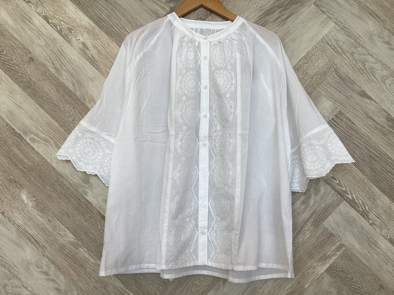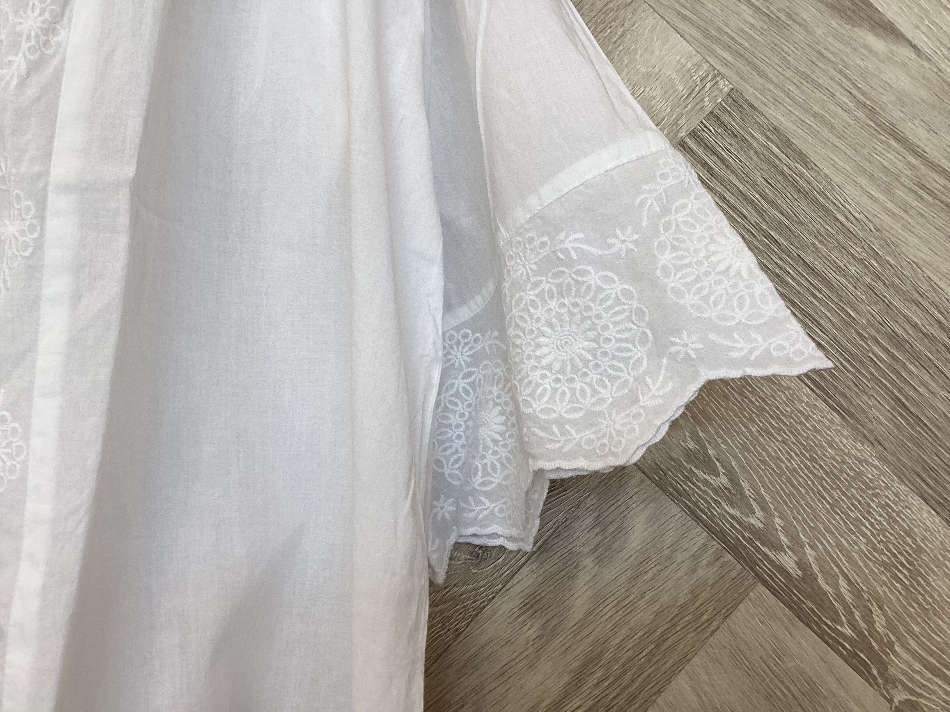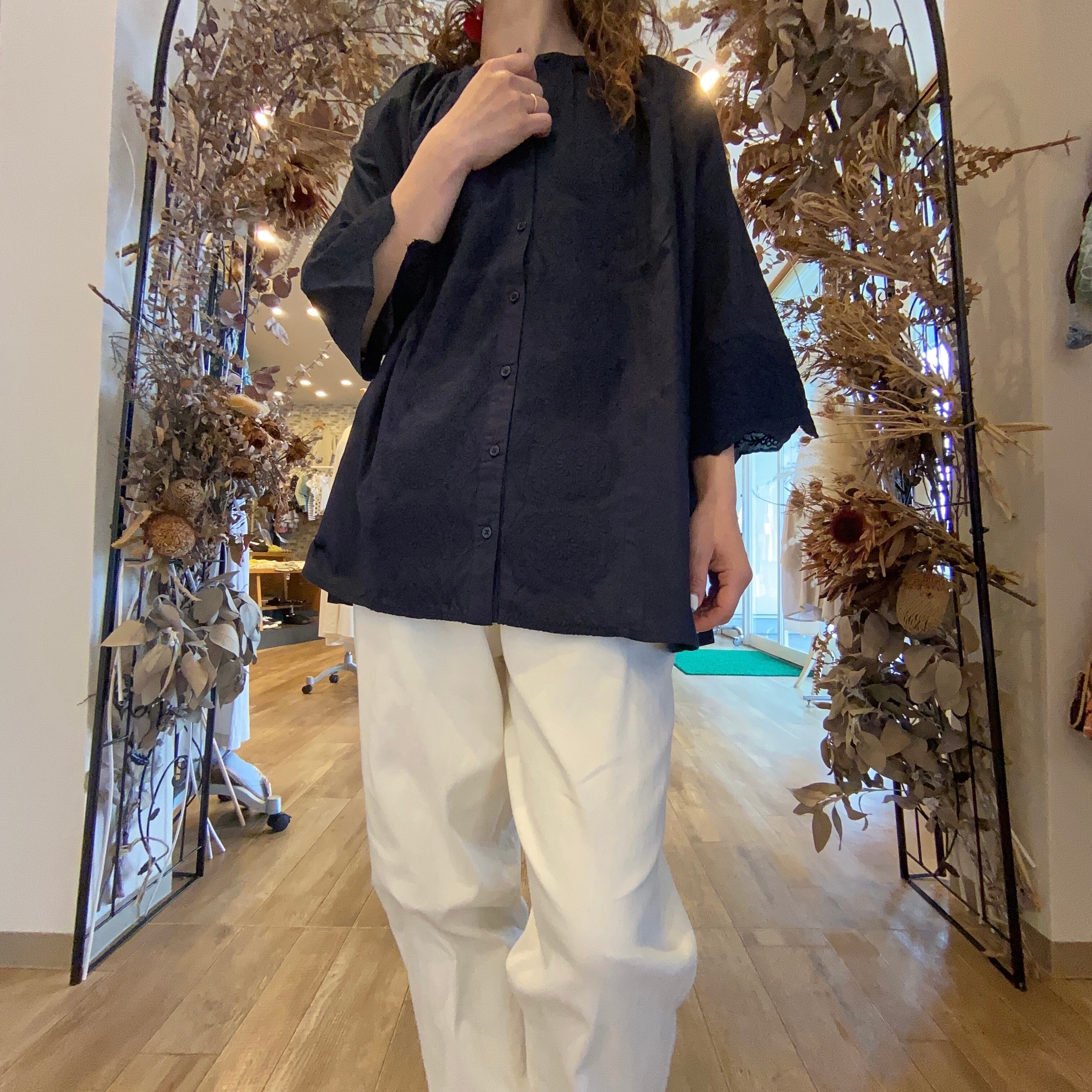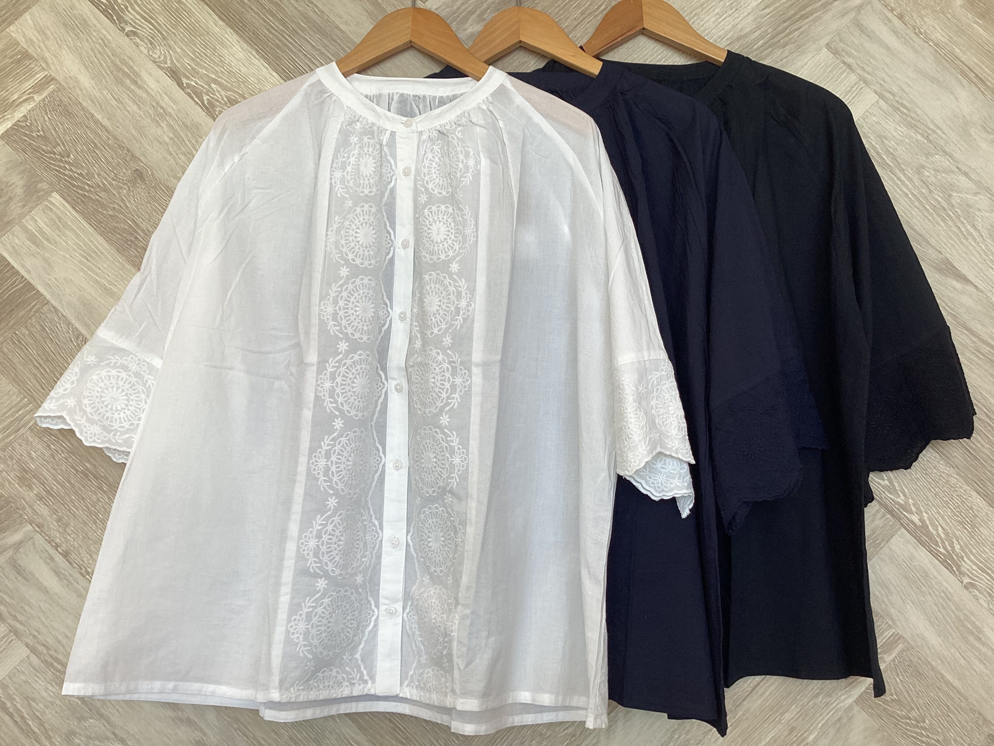 前見頃のシフリー刺繍と袖口のスカラップ刺繍が華やかでシンプルながらポイントとなっています