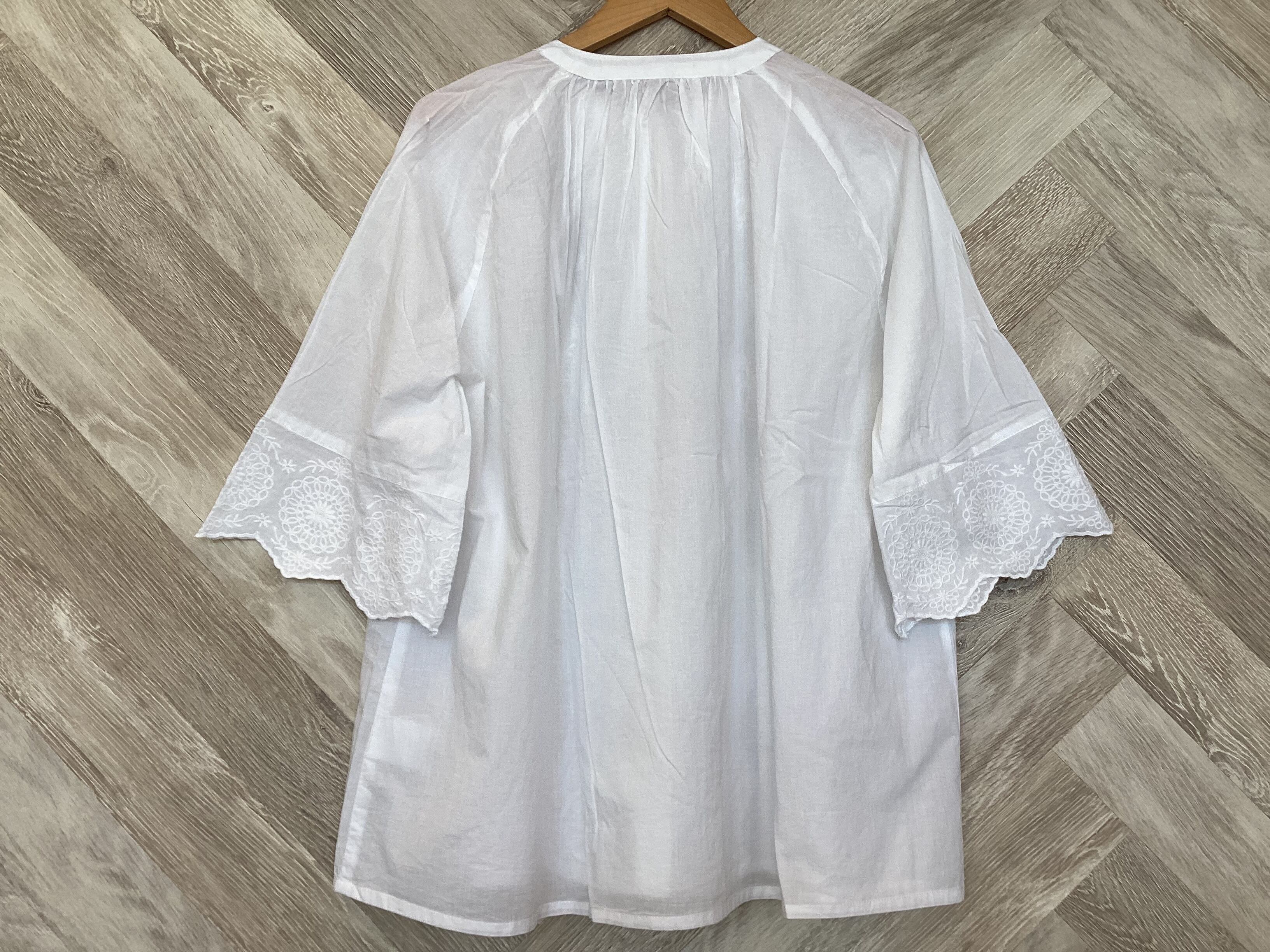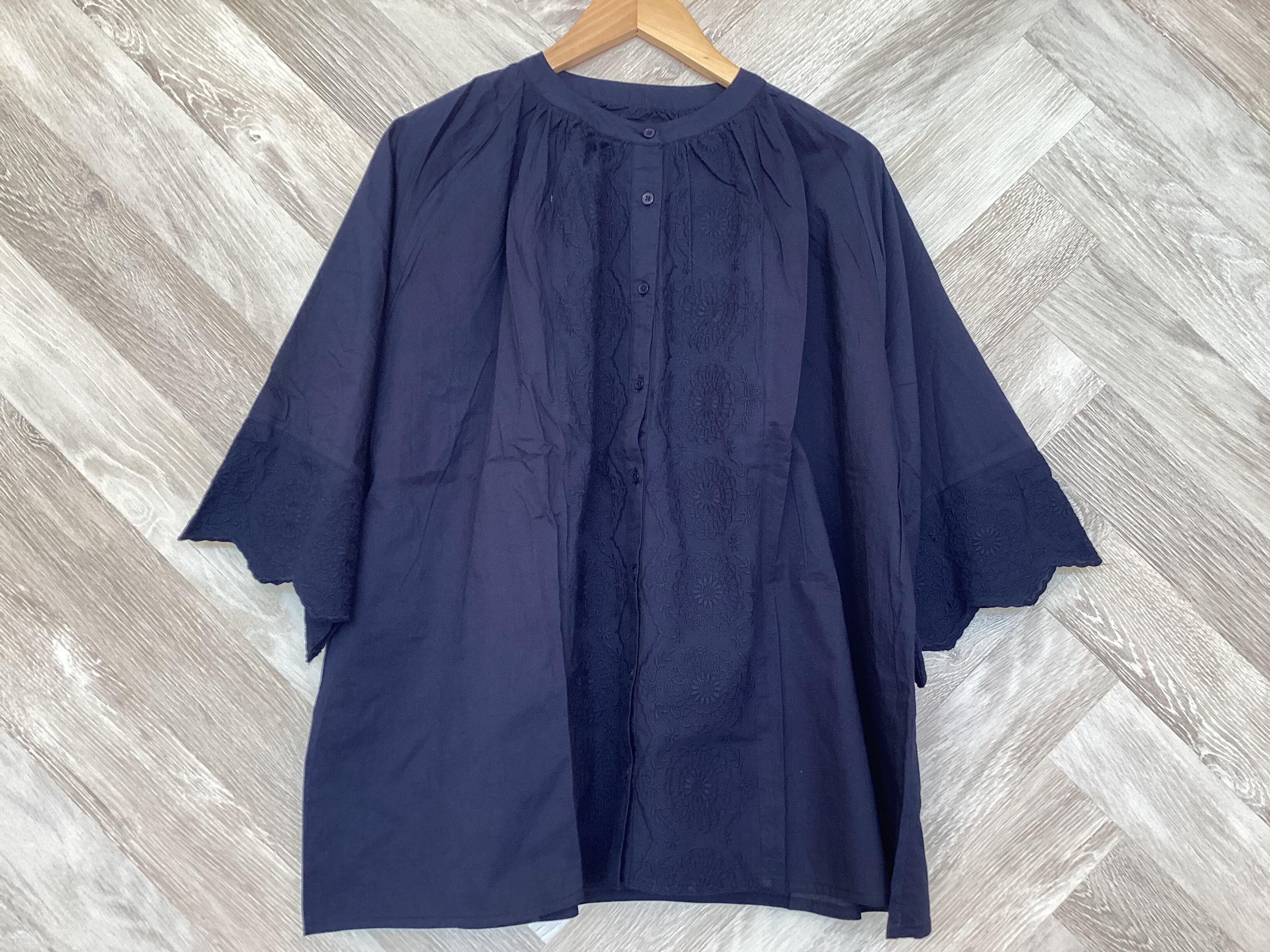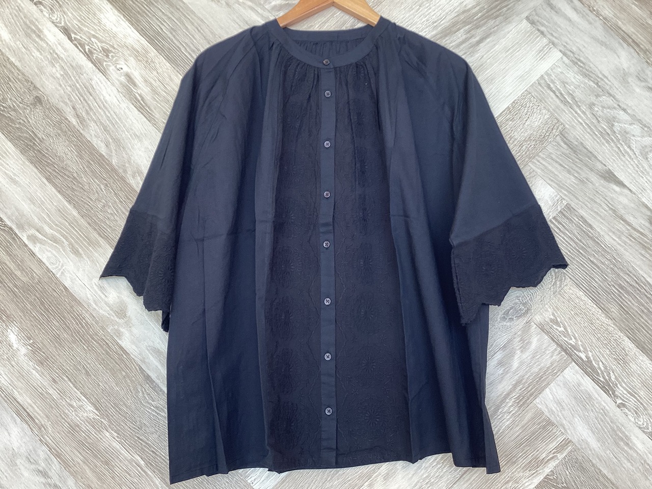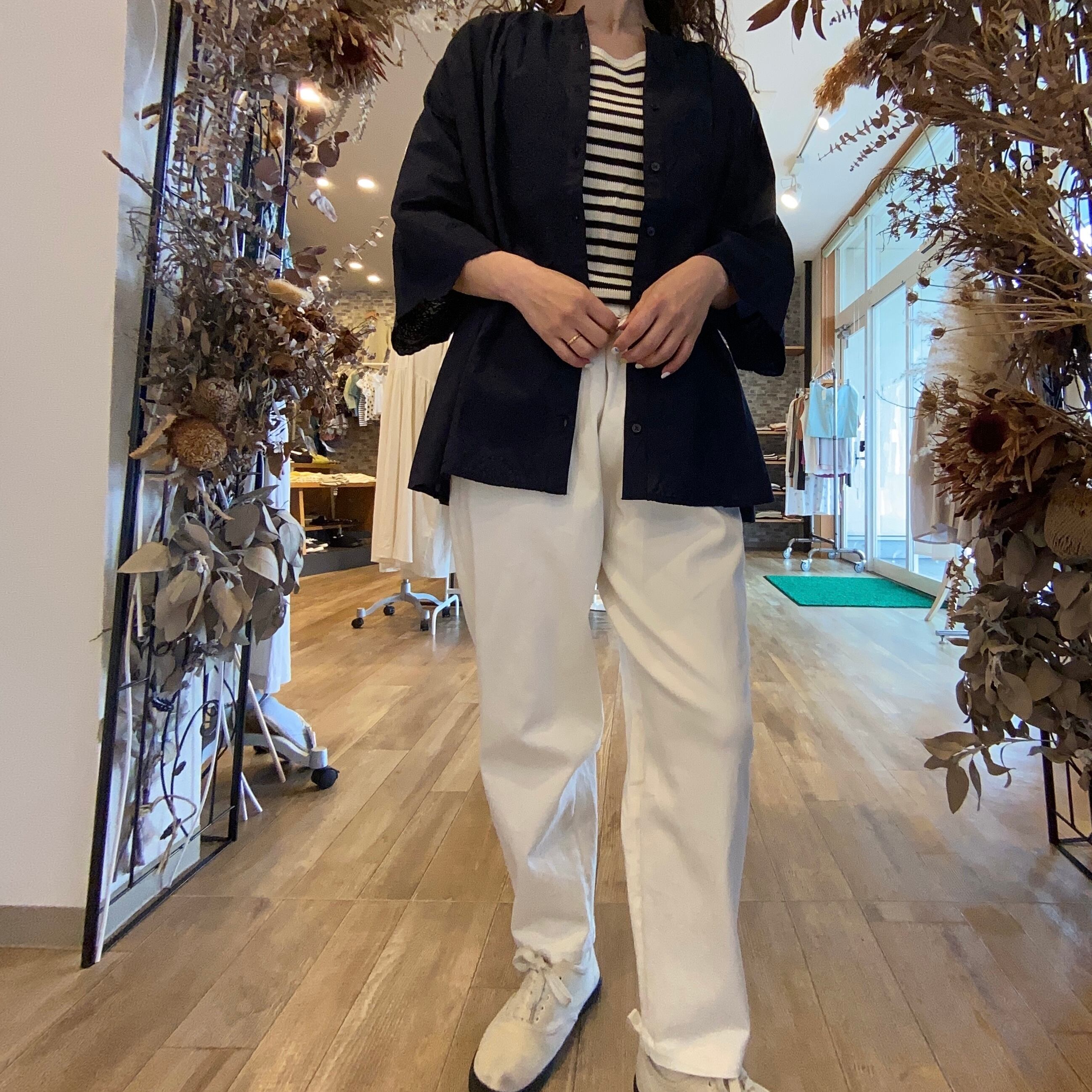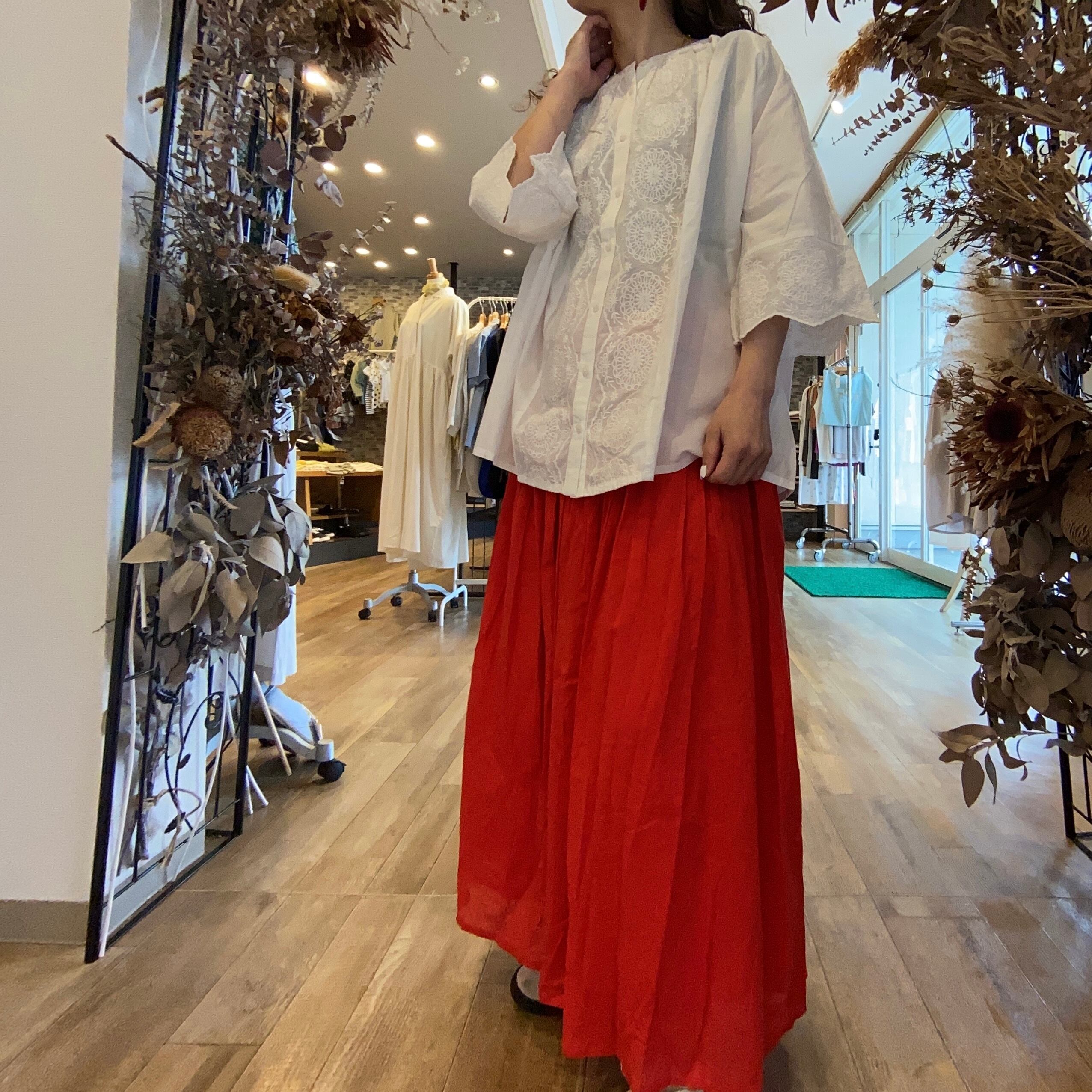 前見頃のシフリー刺繍と袖口のスカラップ刺繍が華やかでシンプルながらポイントとなっています