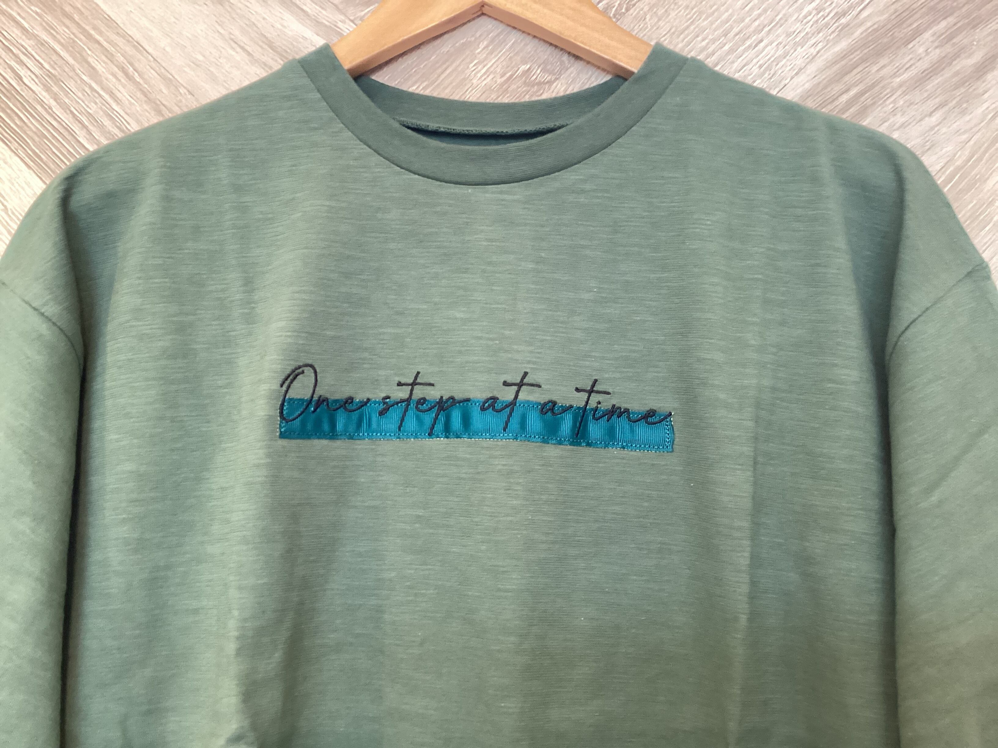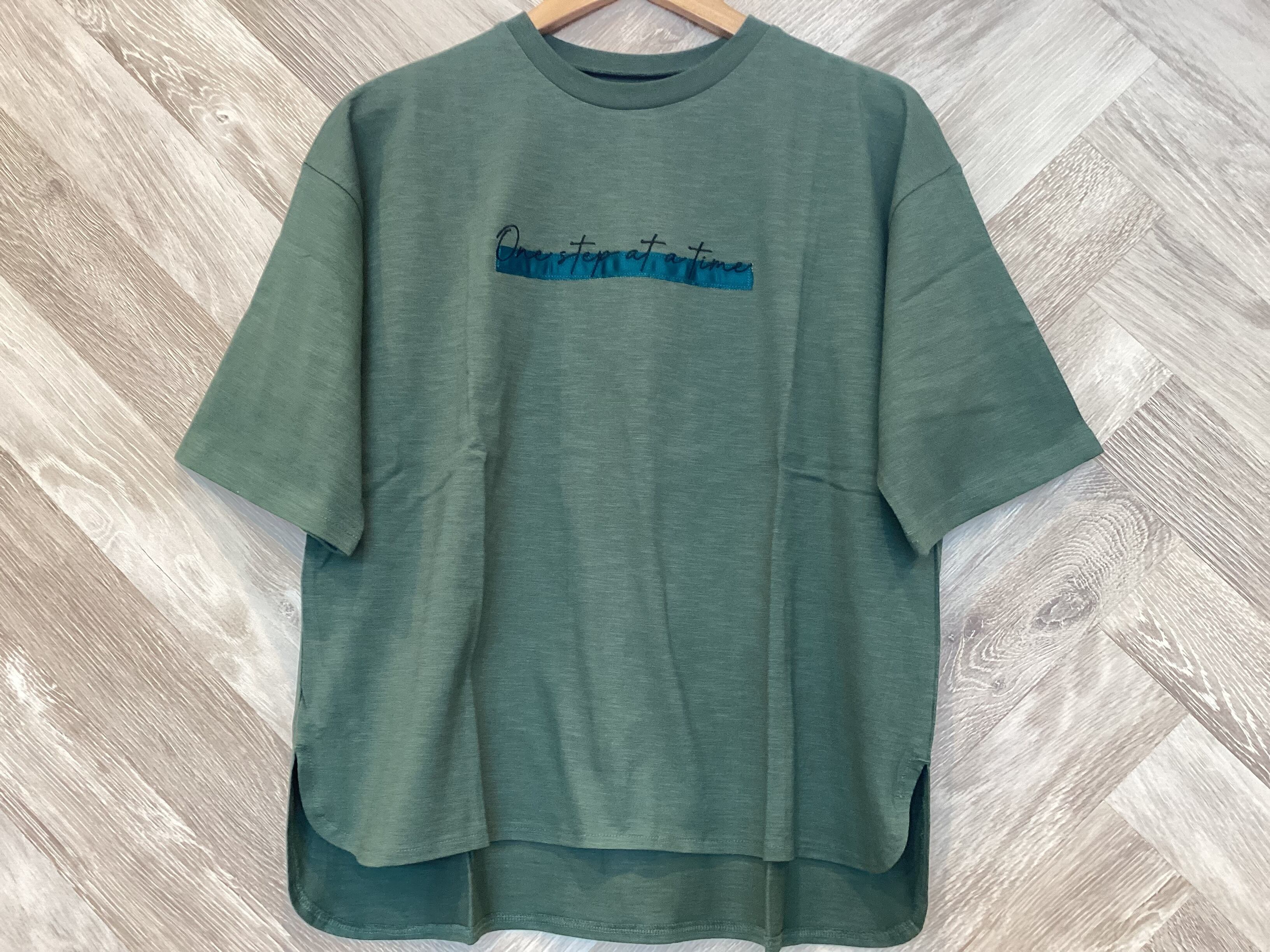 テープ&ロゴ刺繍が目を惹くラウンドヘムTシャツ