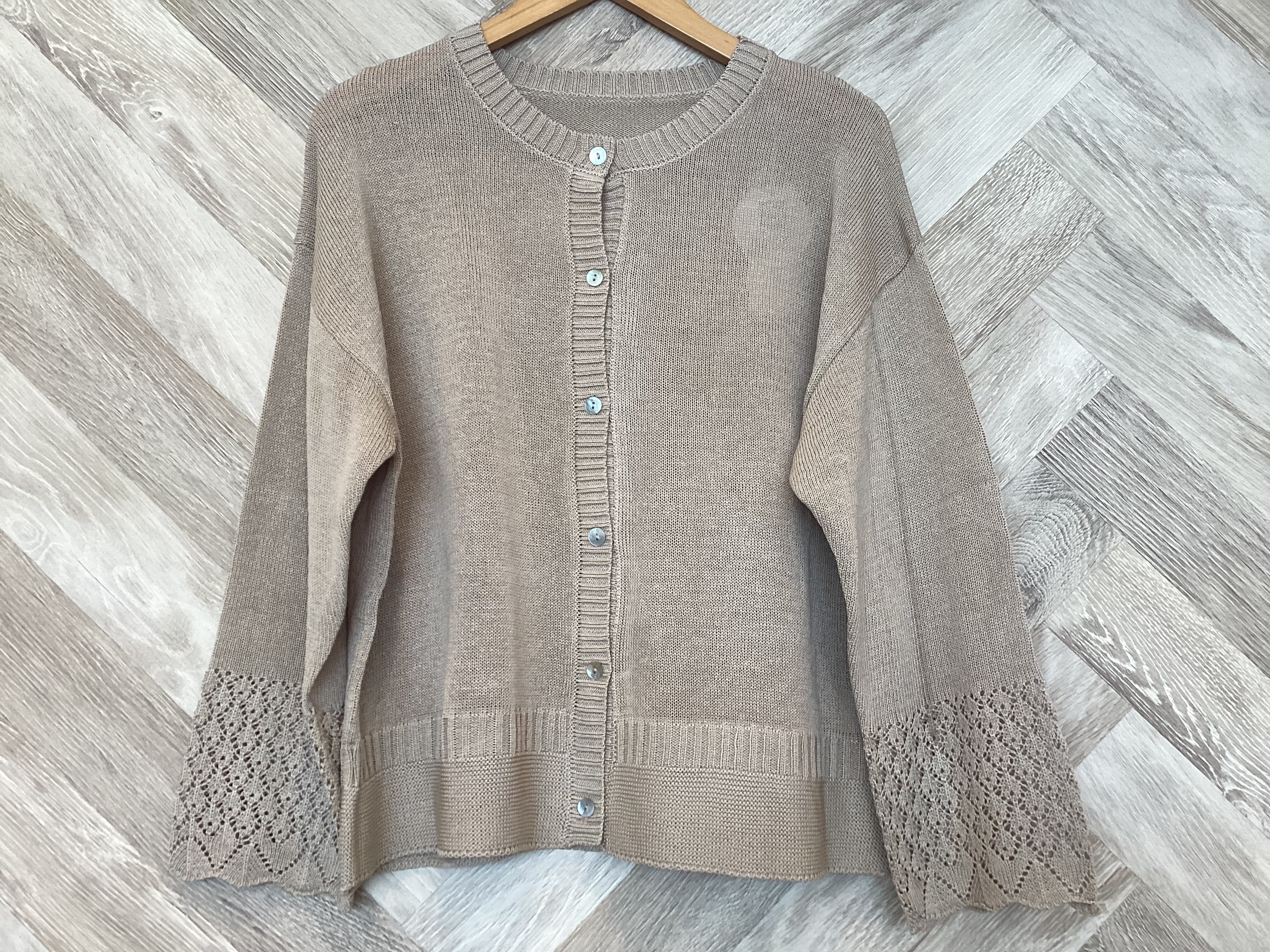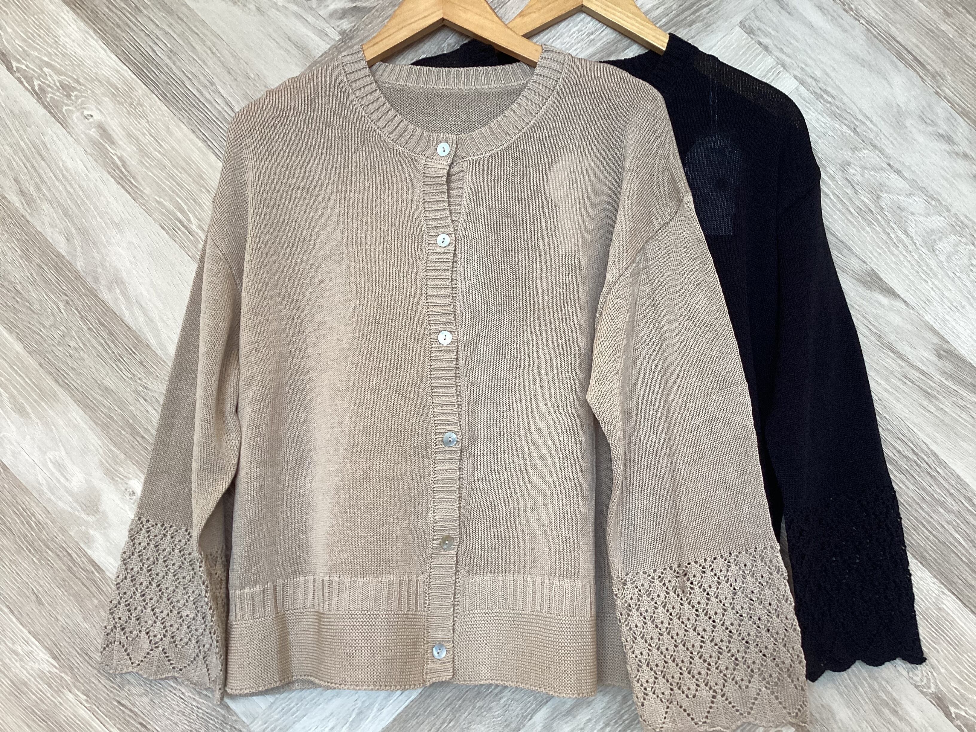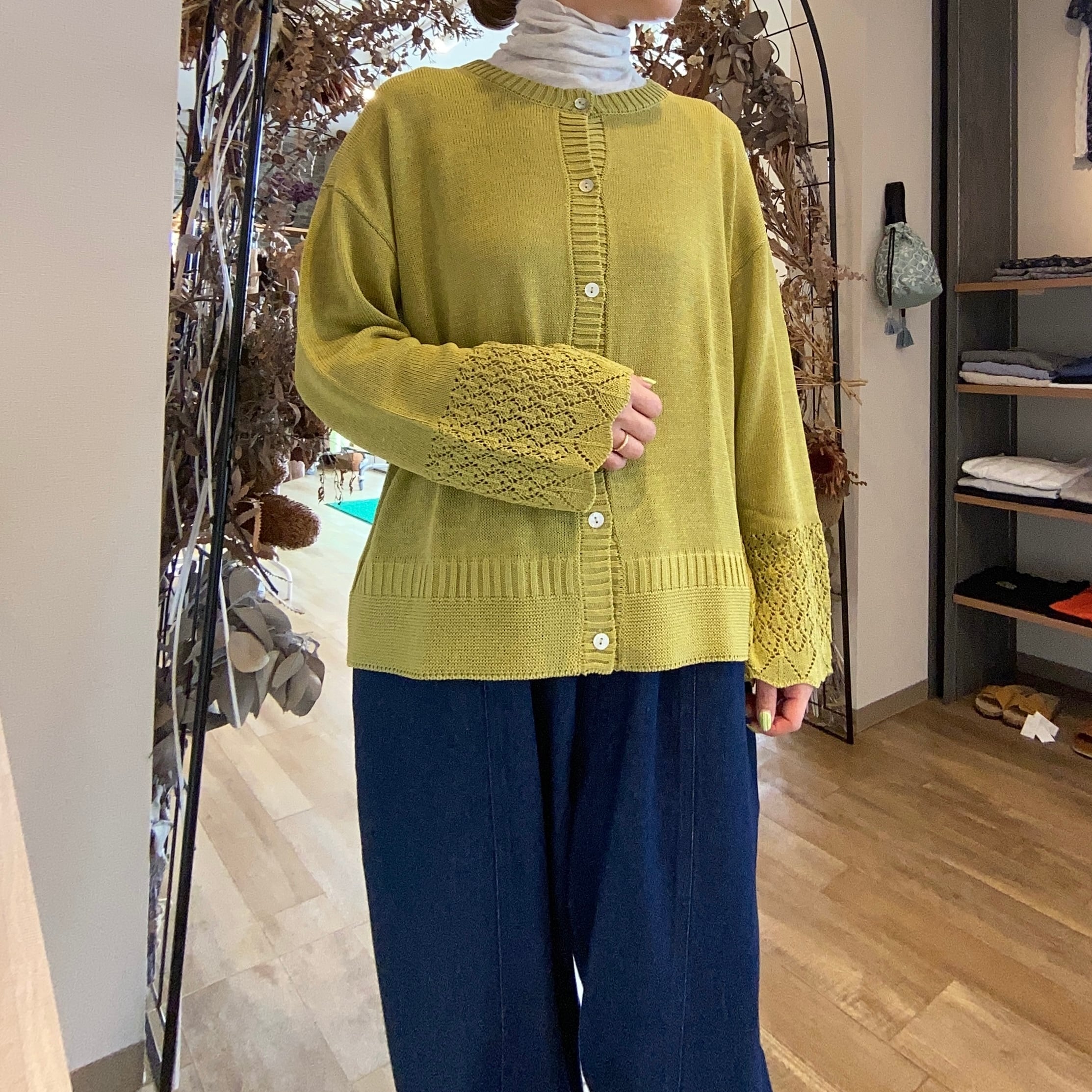 心地よい肌触りでシンプルながらも袖口の透かし柄編みが可愛らしいアイテムなのでデイリーユースに大活躍です