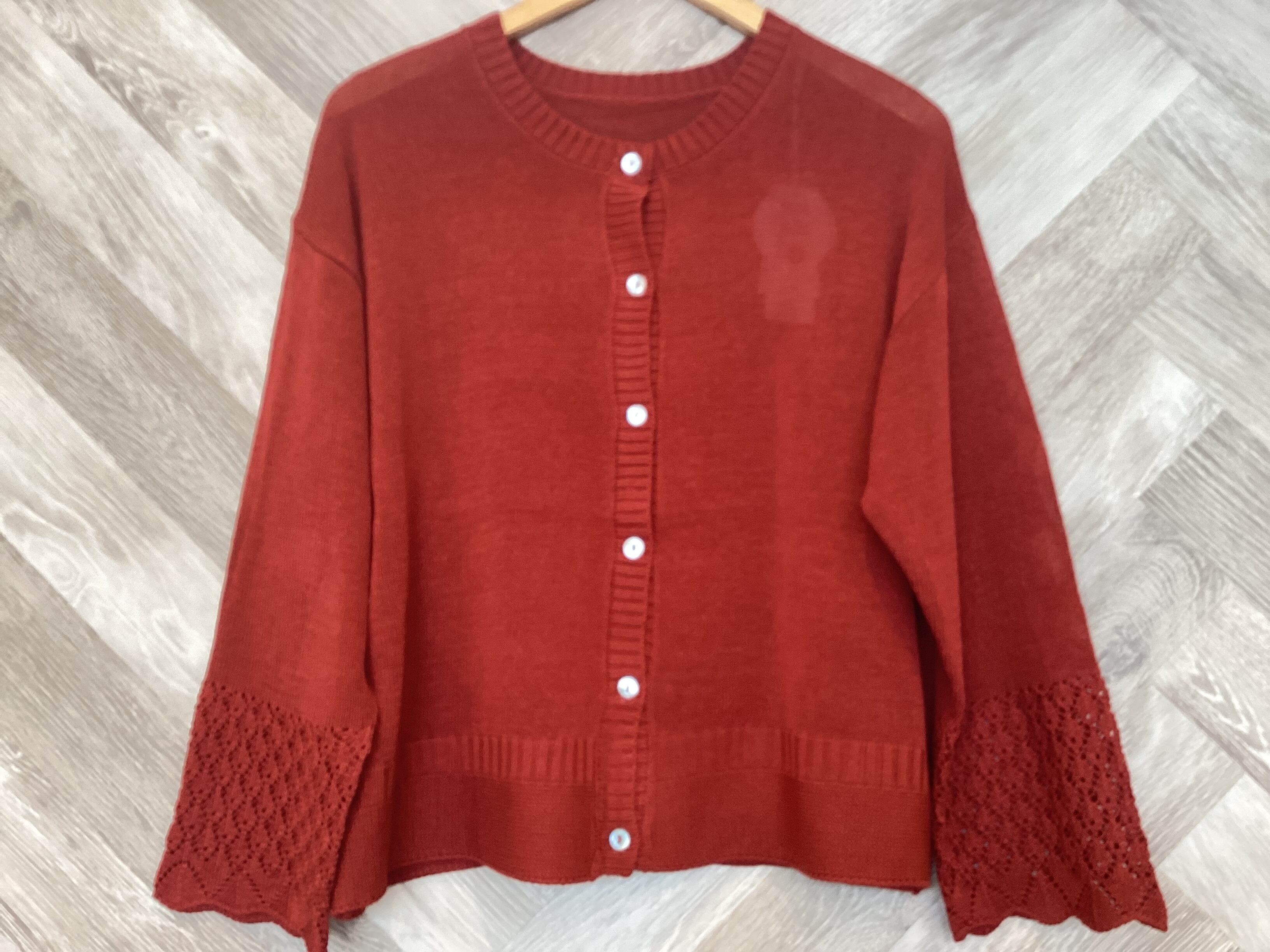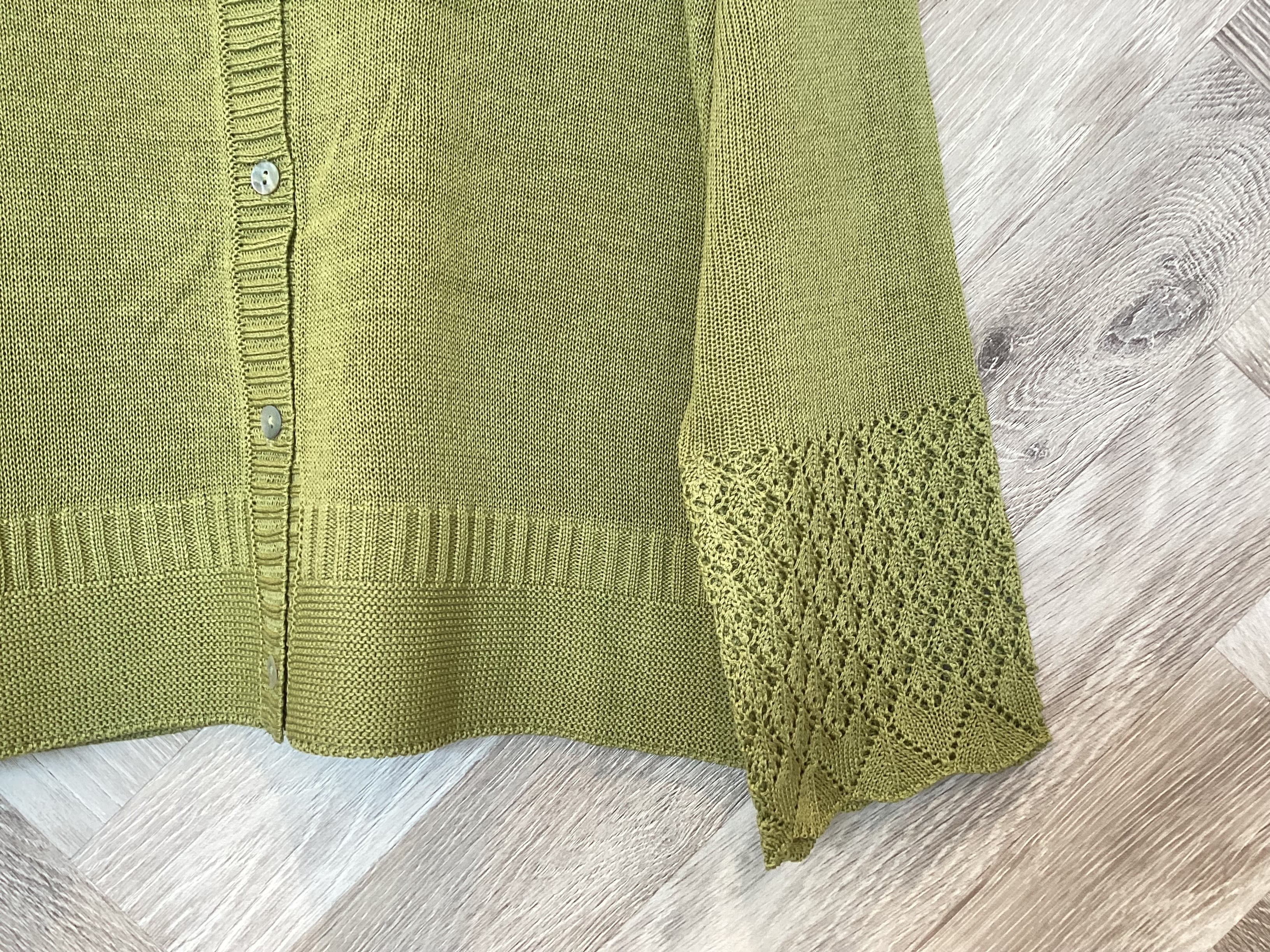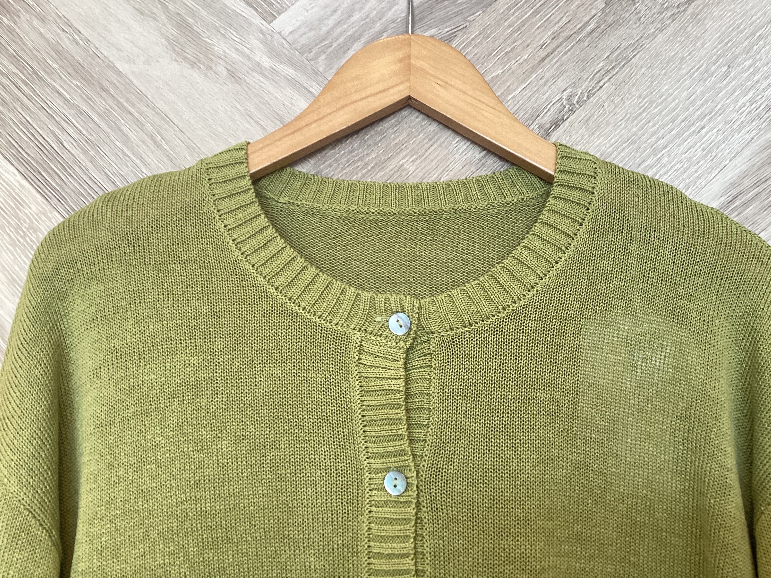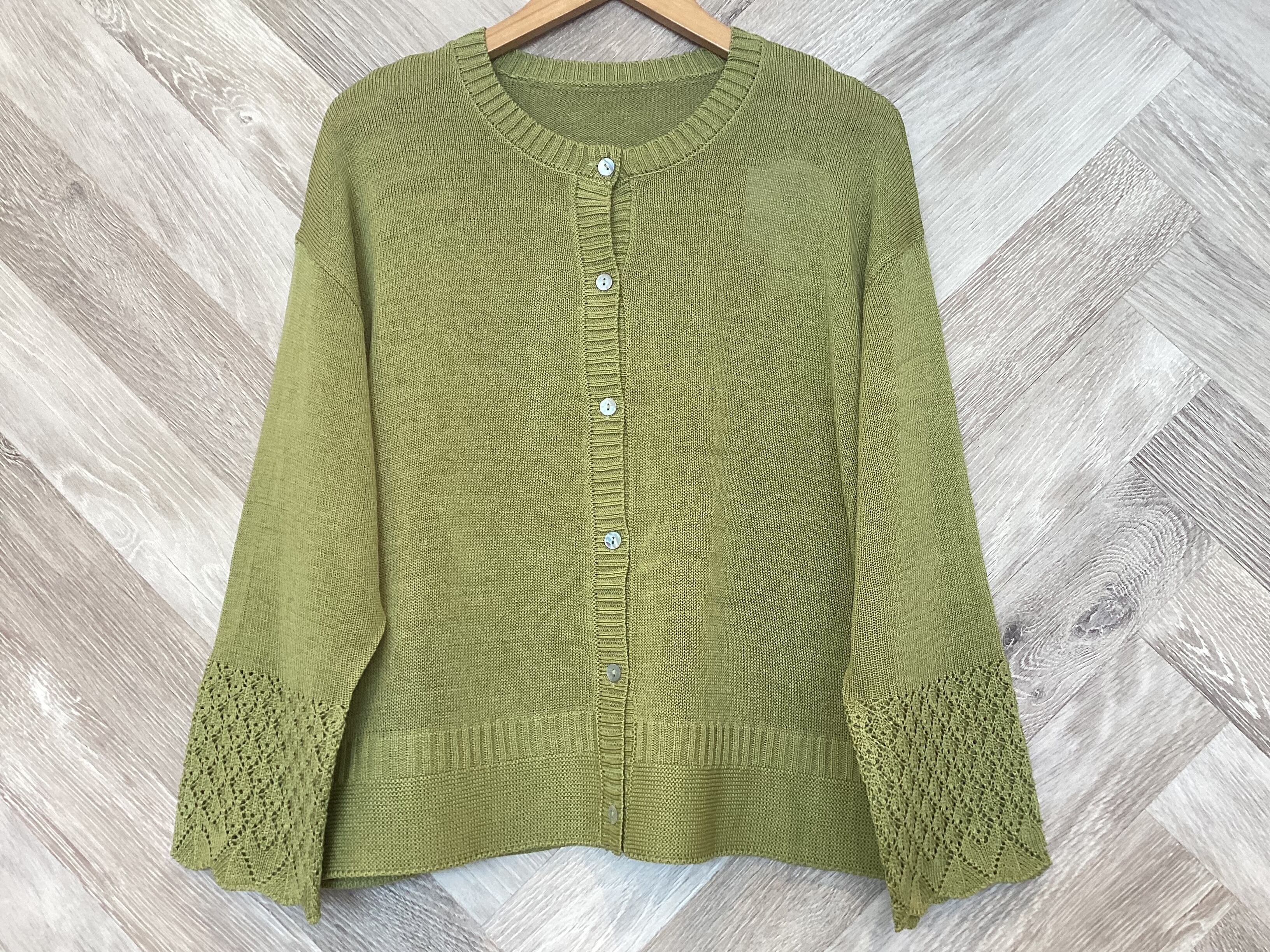心地よい肌触りでシンプルながらも袖口の透かし柄編みが可愛らしいアイテムなのでデイリーユースに大活躍です