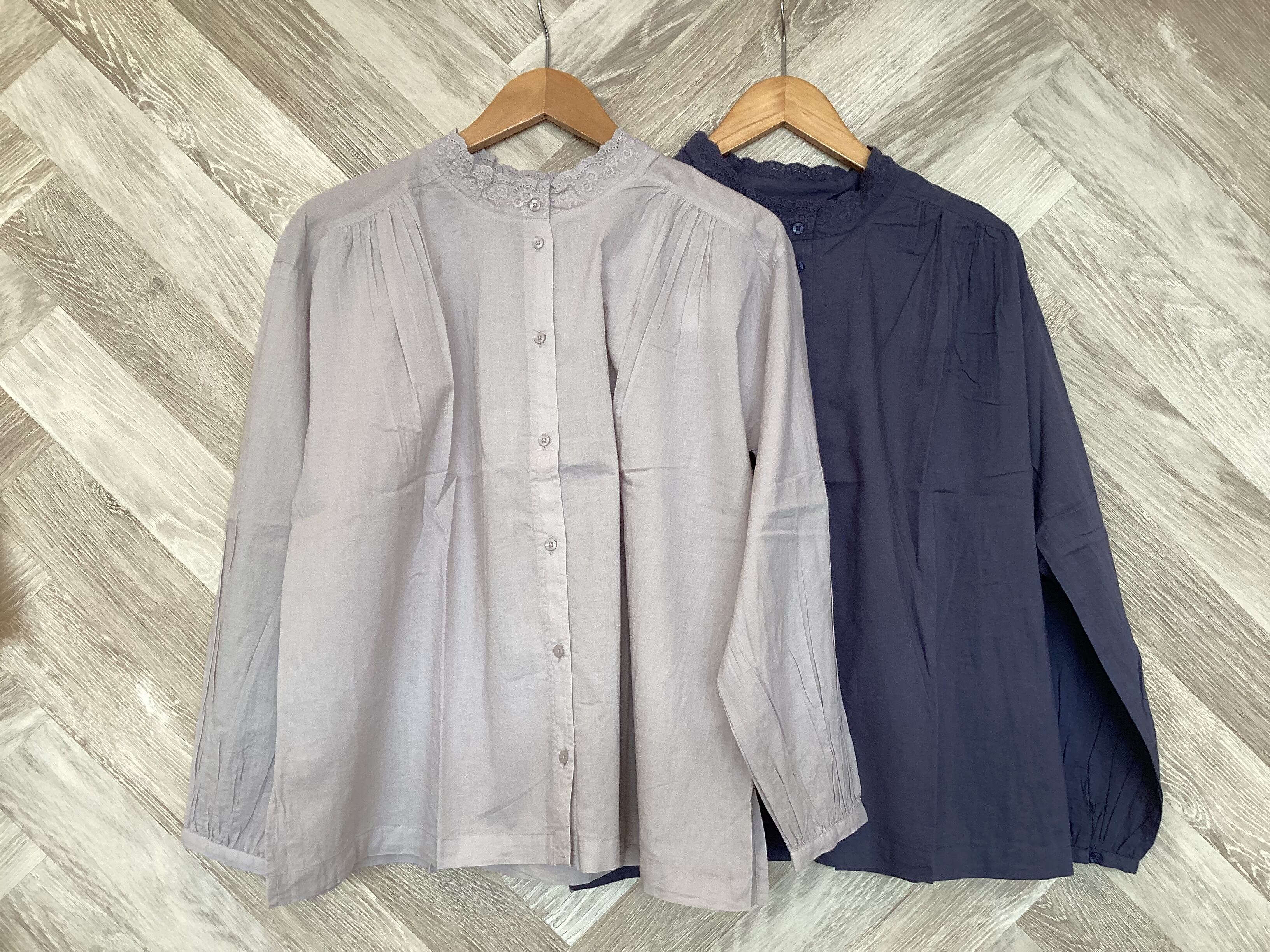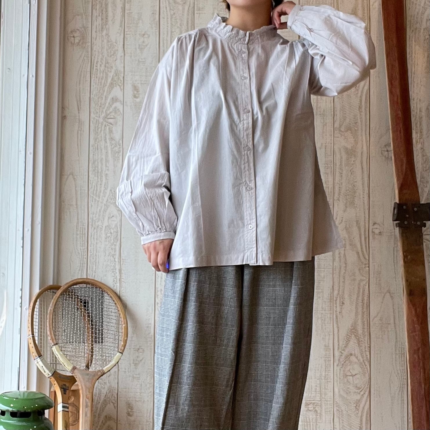 襟に上品な刺繍が施されたブラウスです。