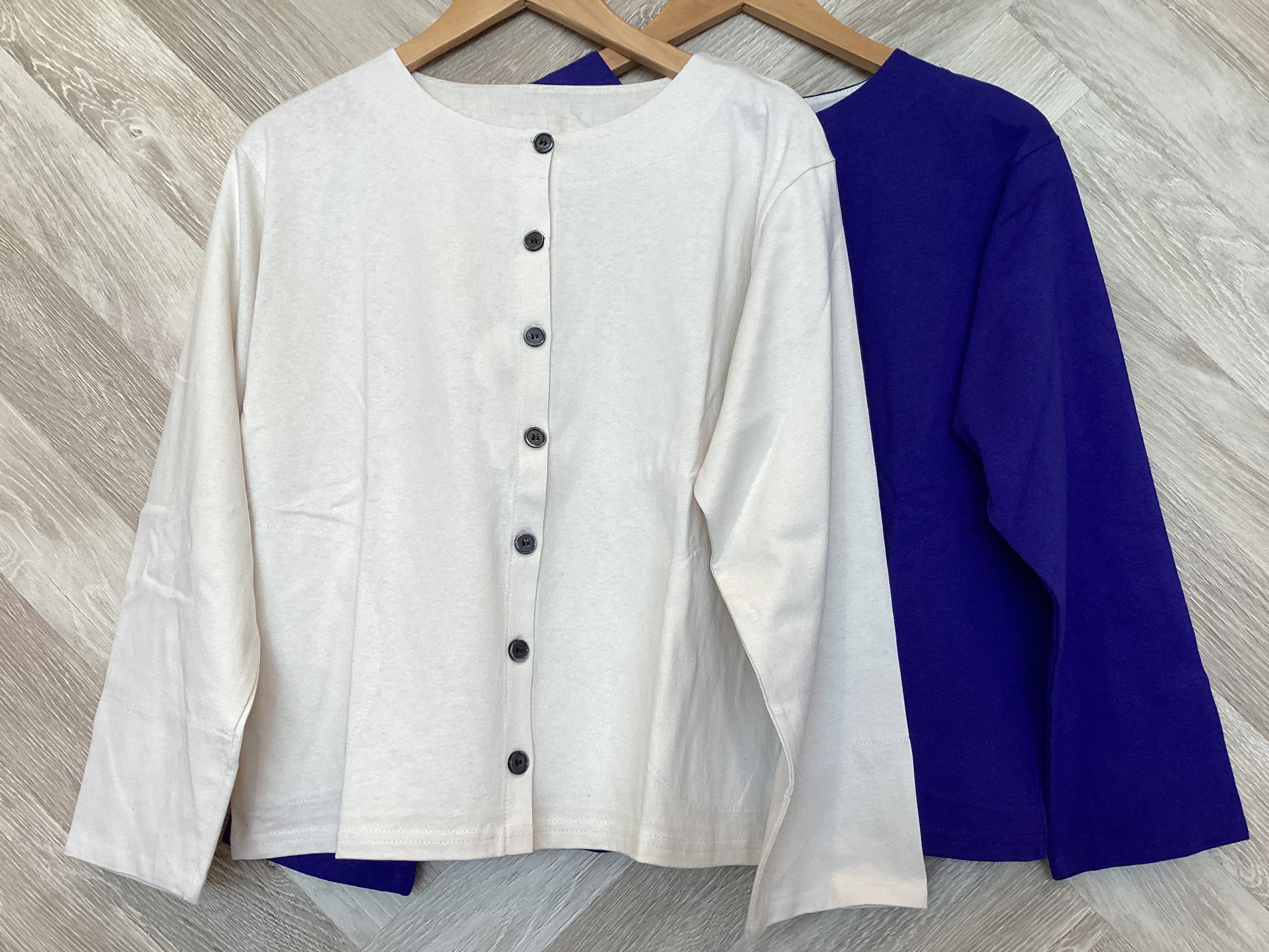 ネックや袖口の見返しにはナチュラルな布帛生地を使い自然な表情に仕上げました