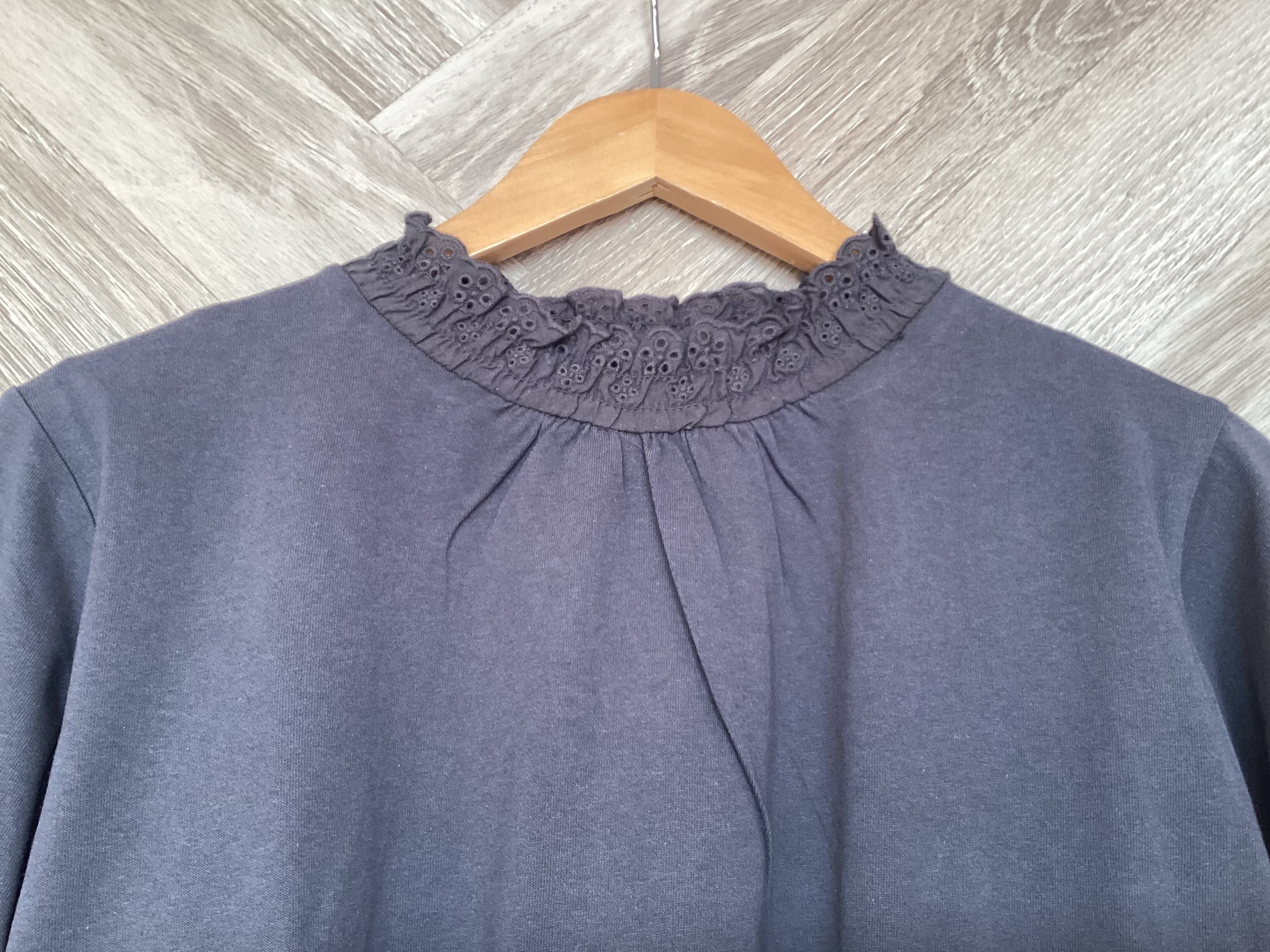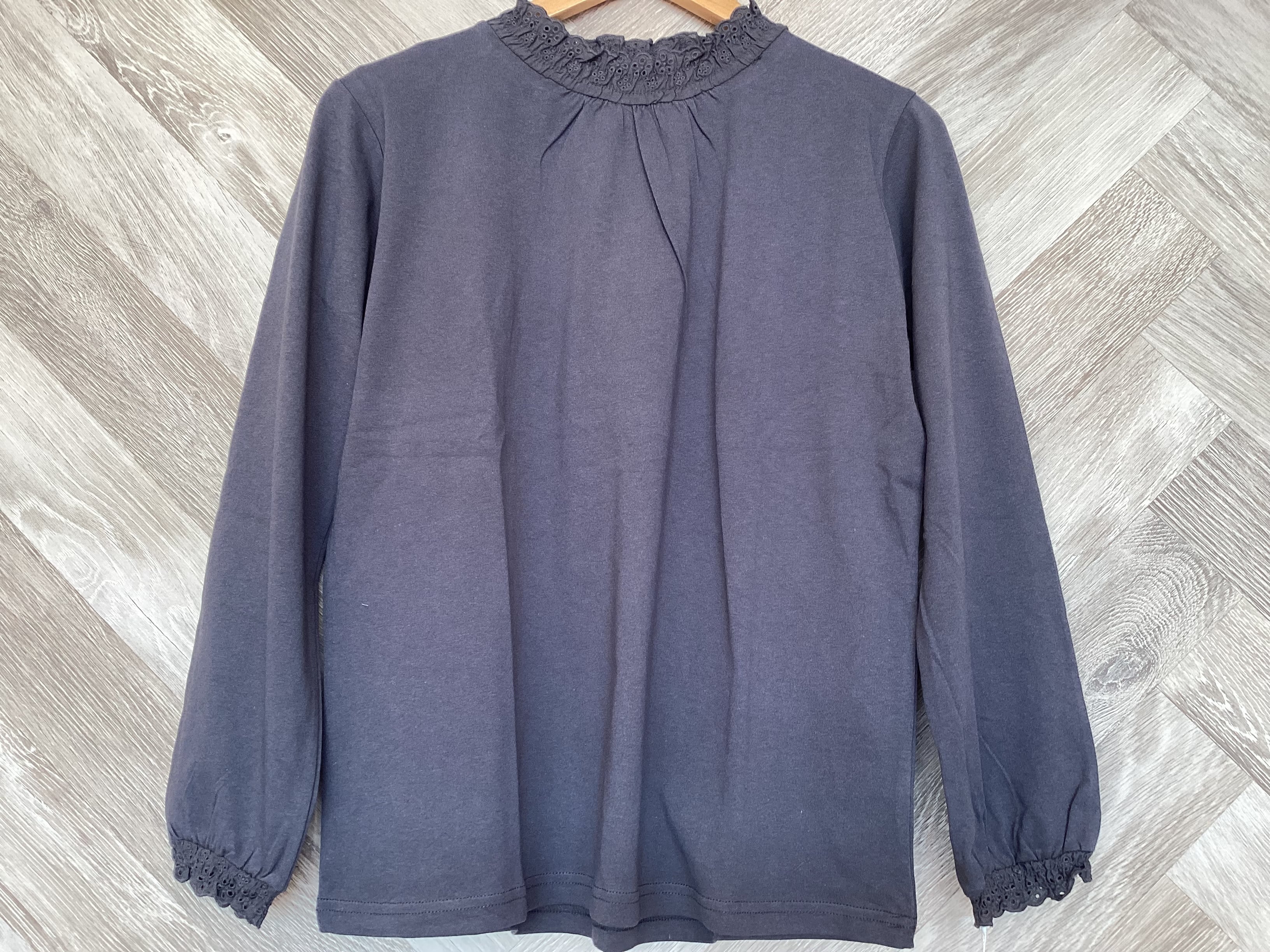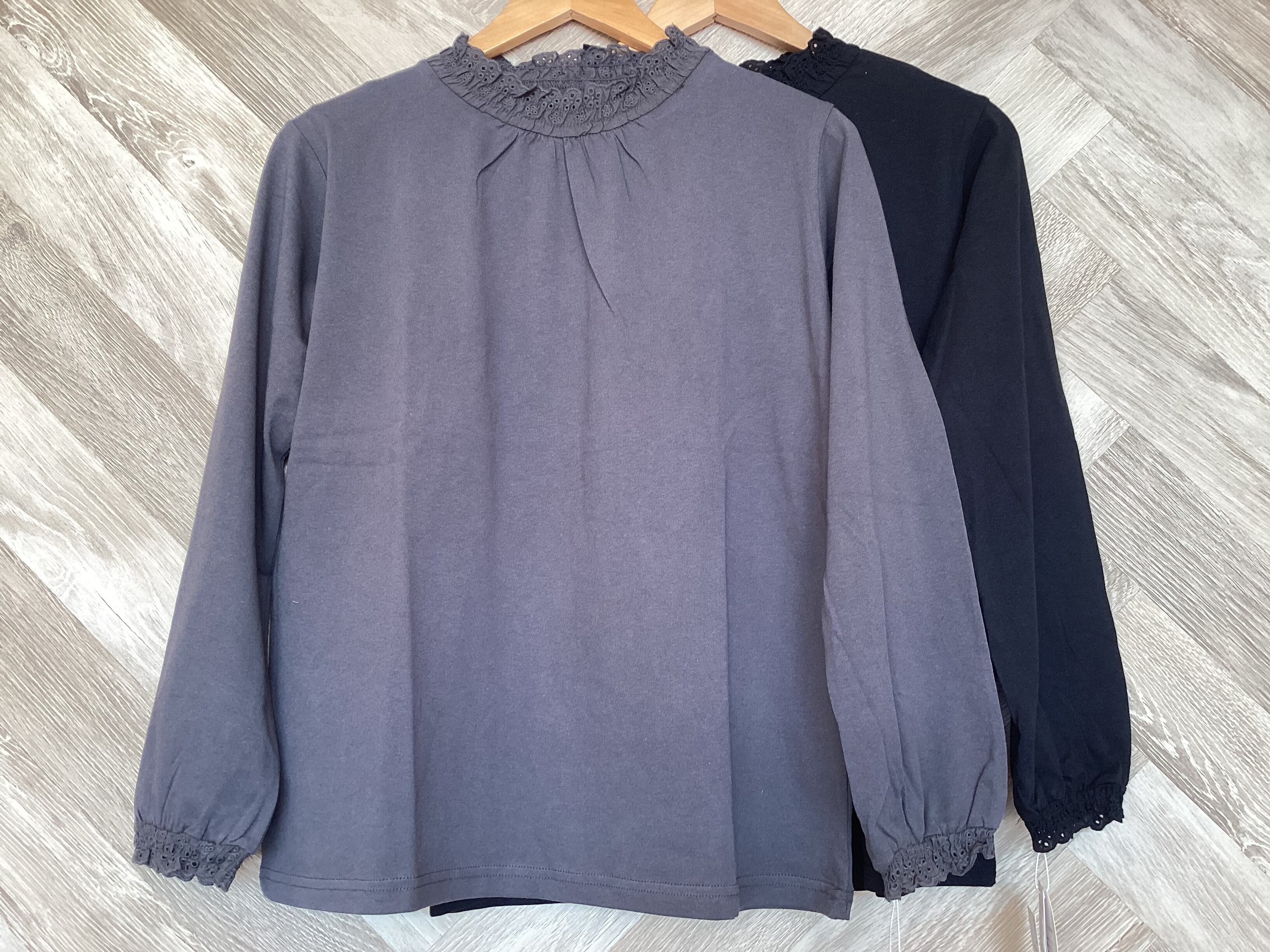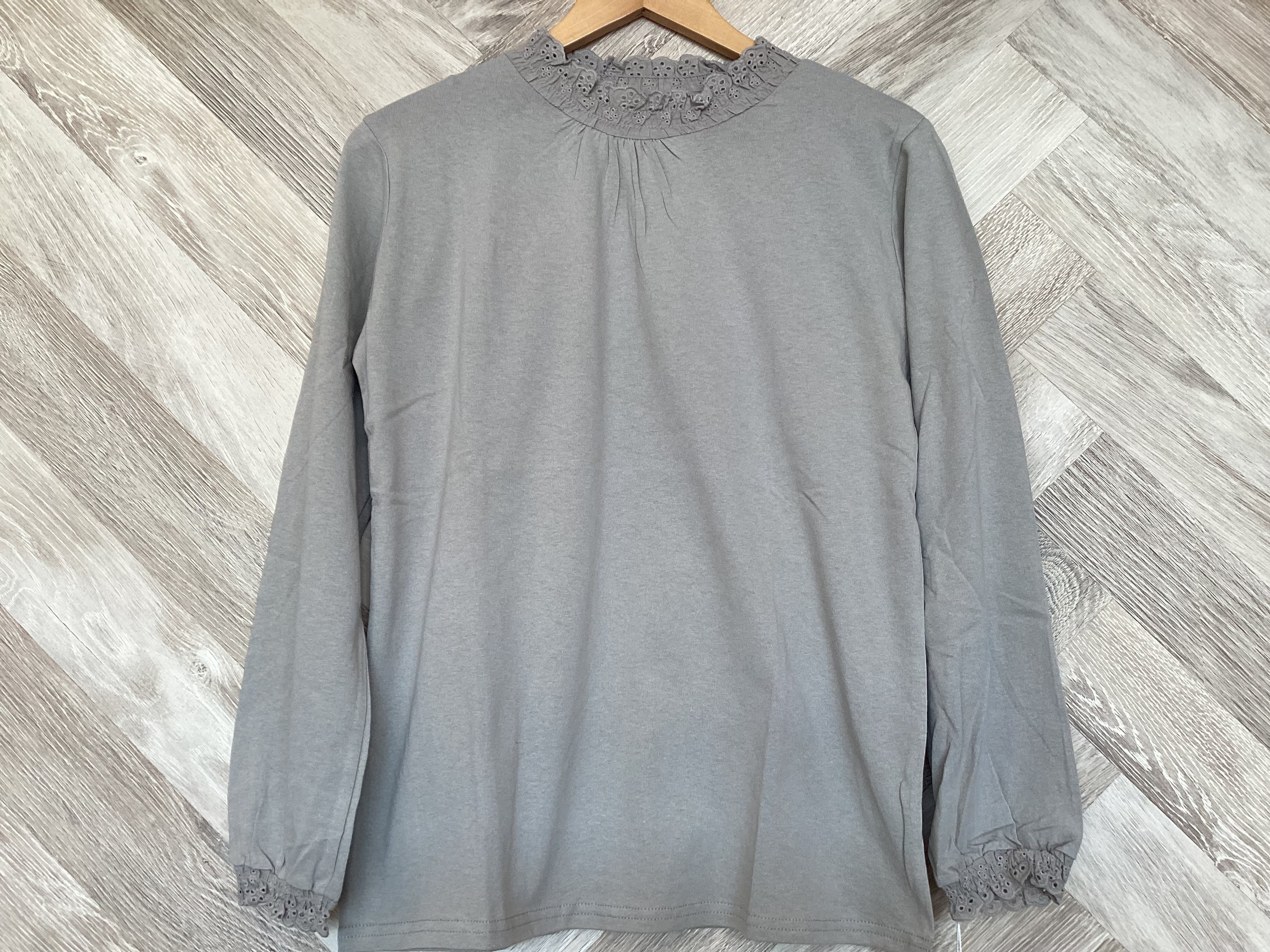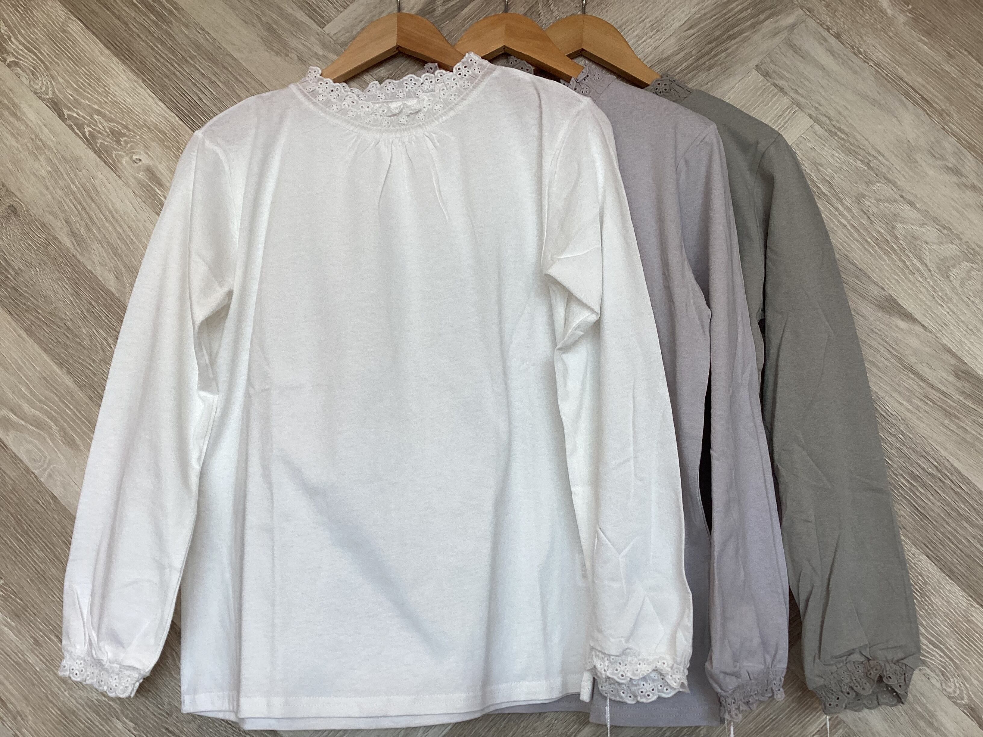 ネックと袖口にあしらったスカラップレースが程よく甘さを添えてくれます