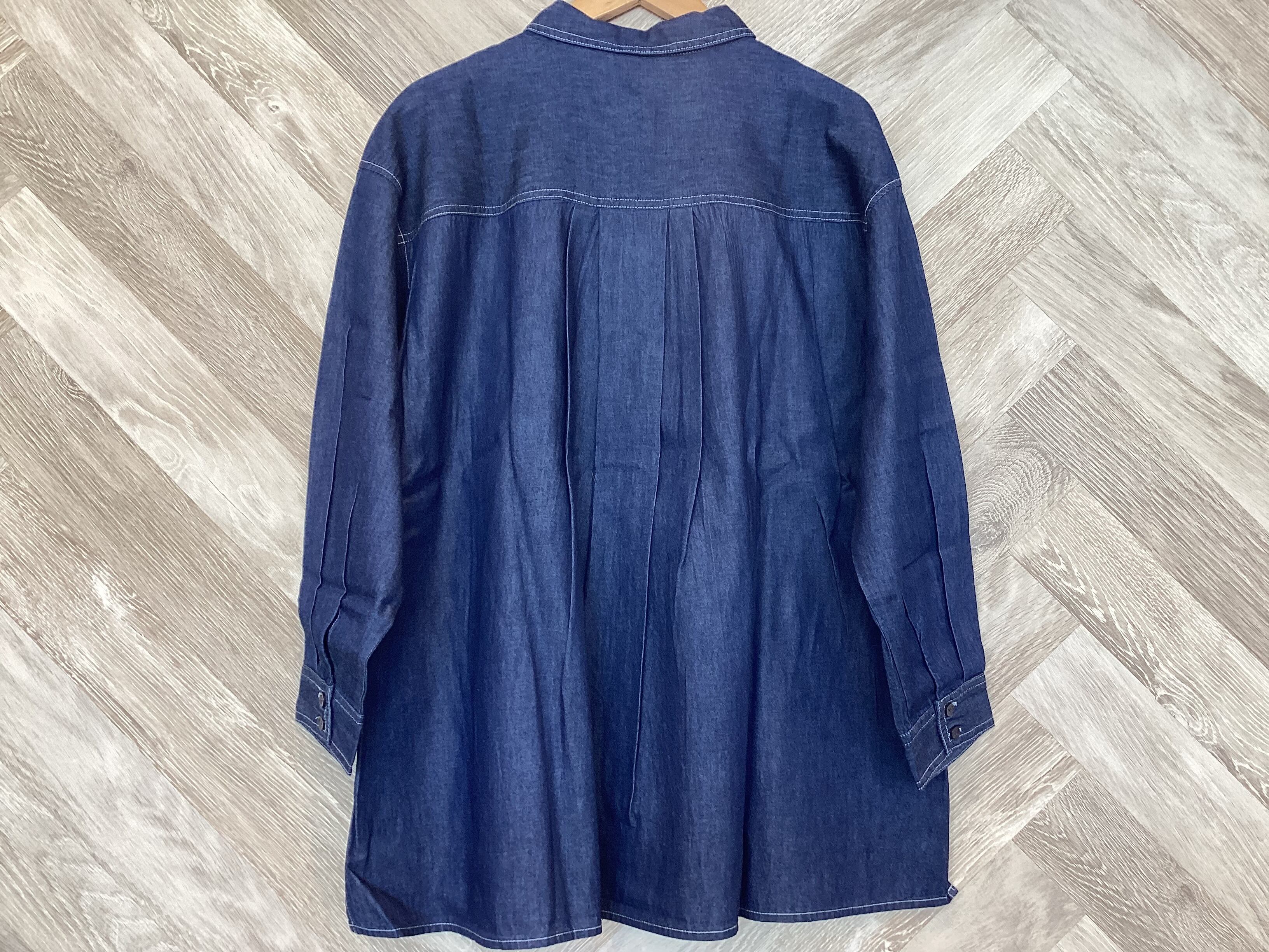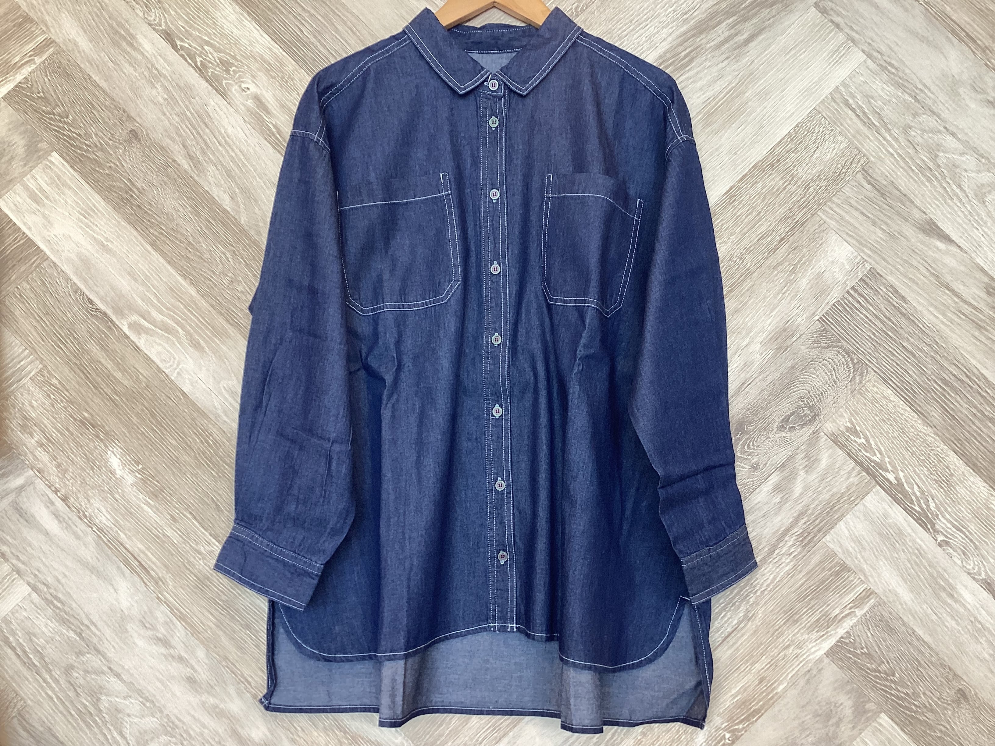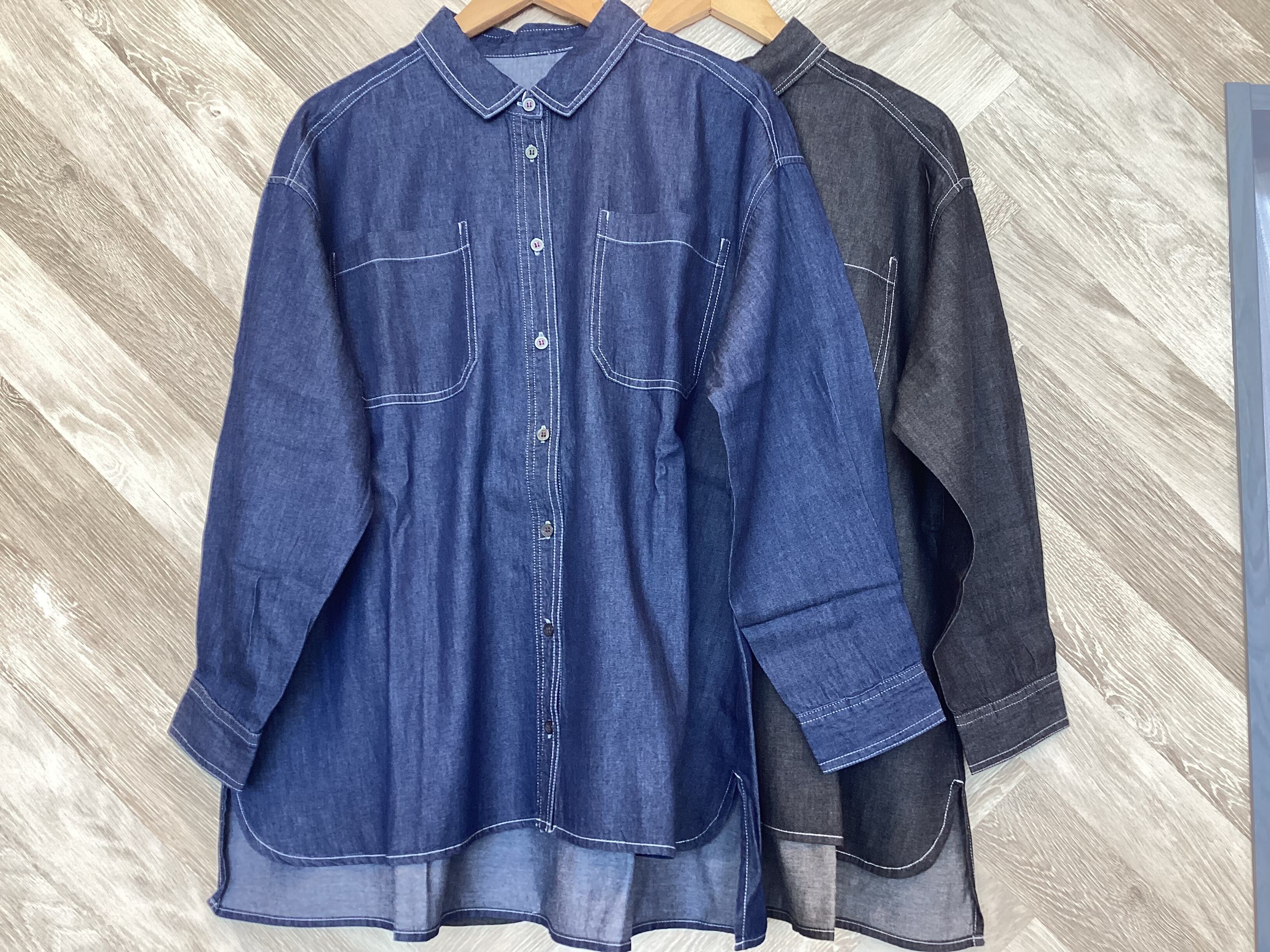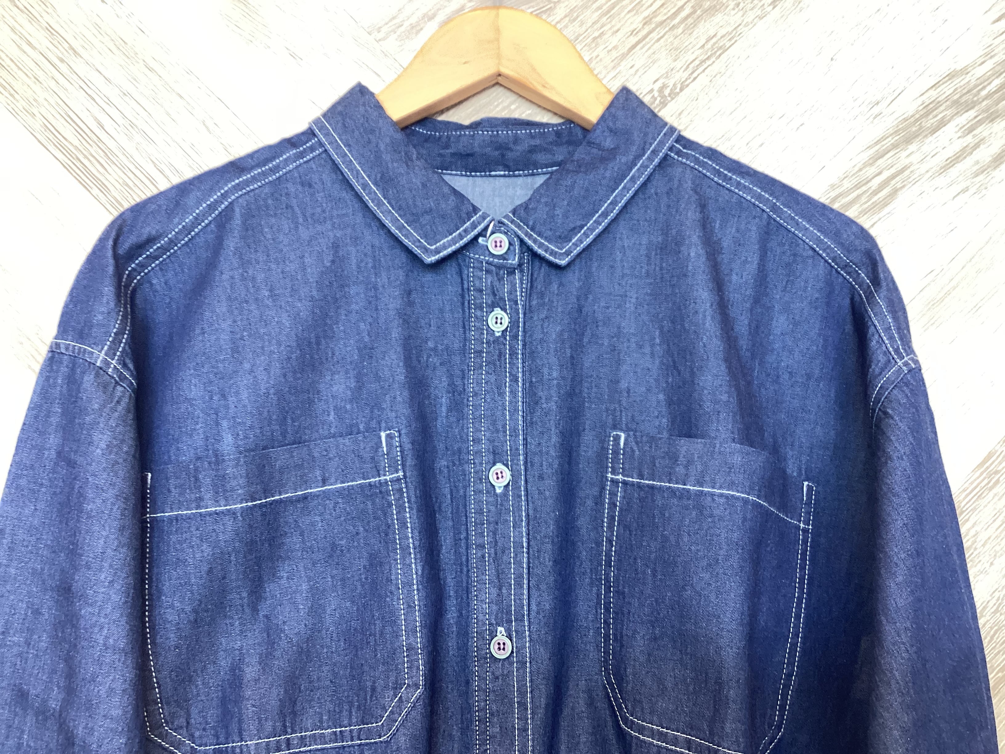 シャツ襟が程よくきちんと感を出してくれるデニムブラウス