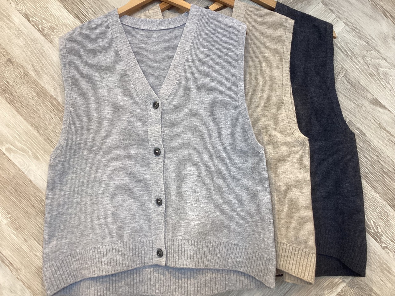 前ボタン開きの首元スッキリとしたVネックでインナーに合わせやすいベストです