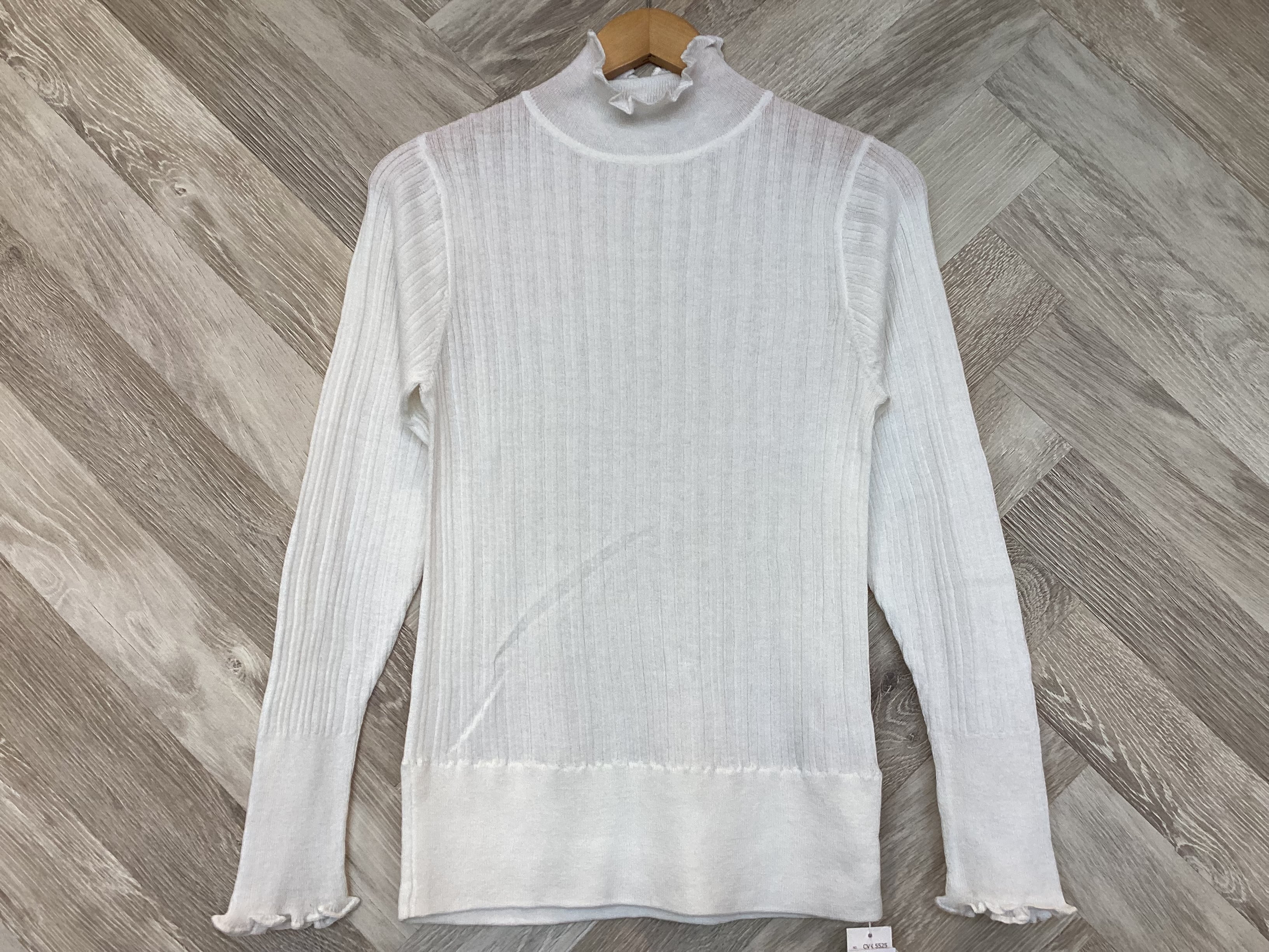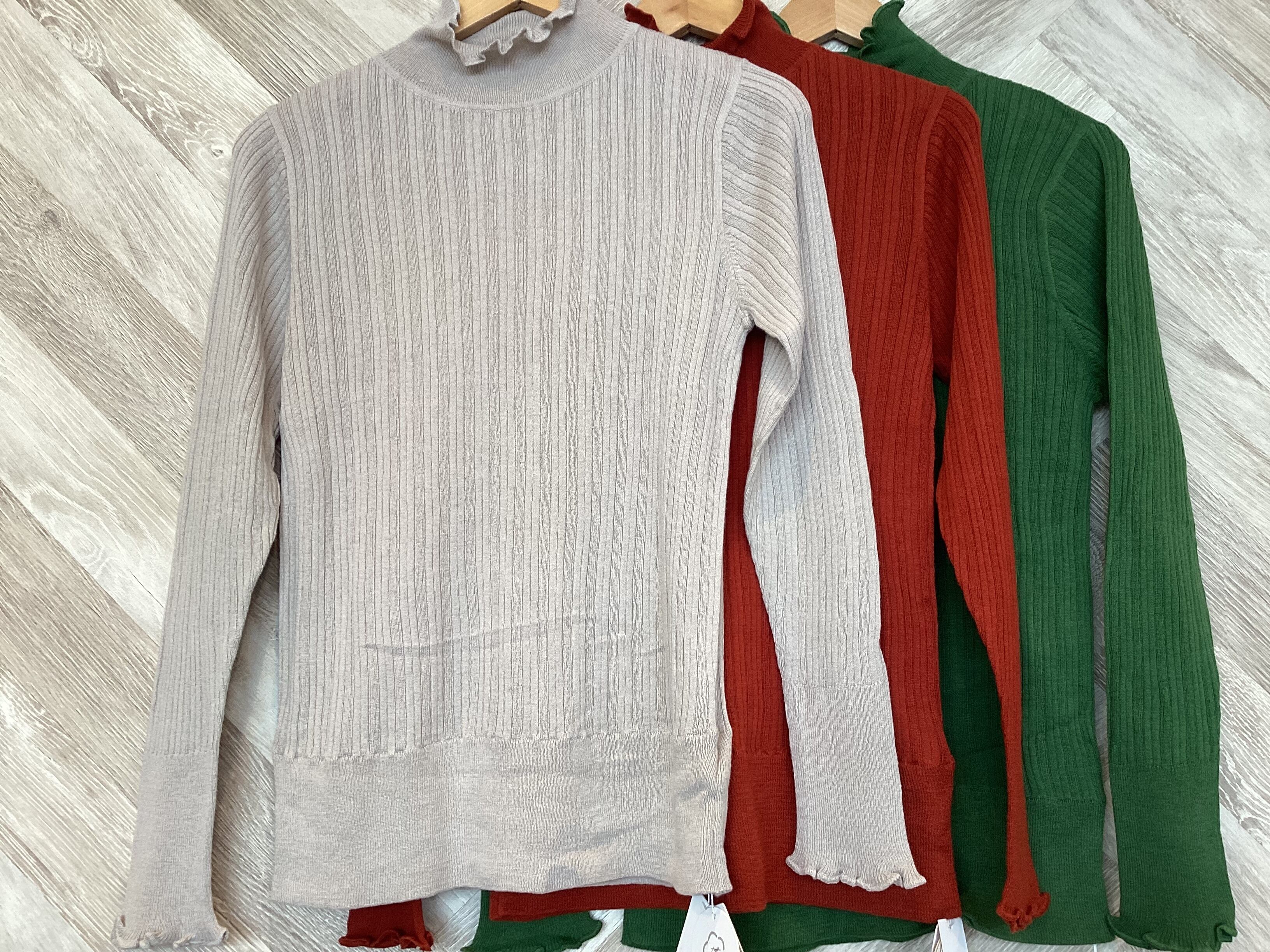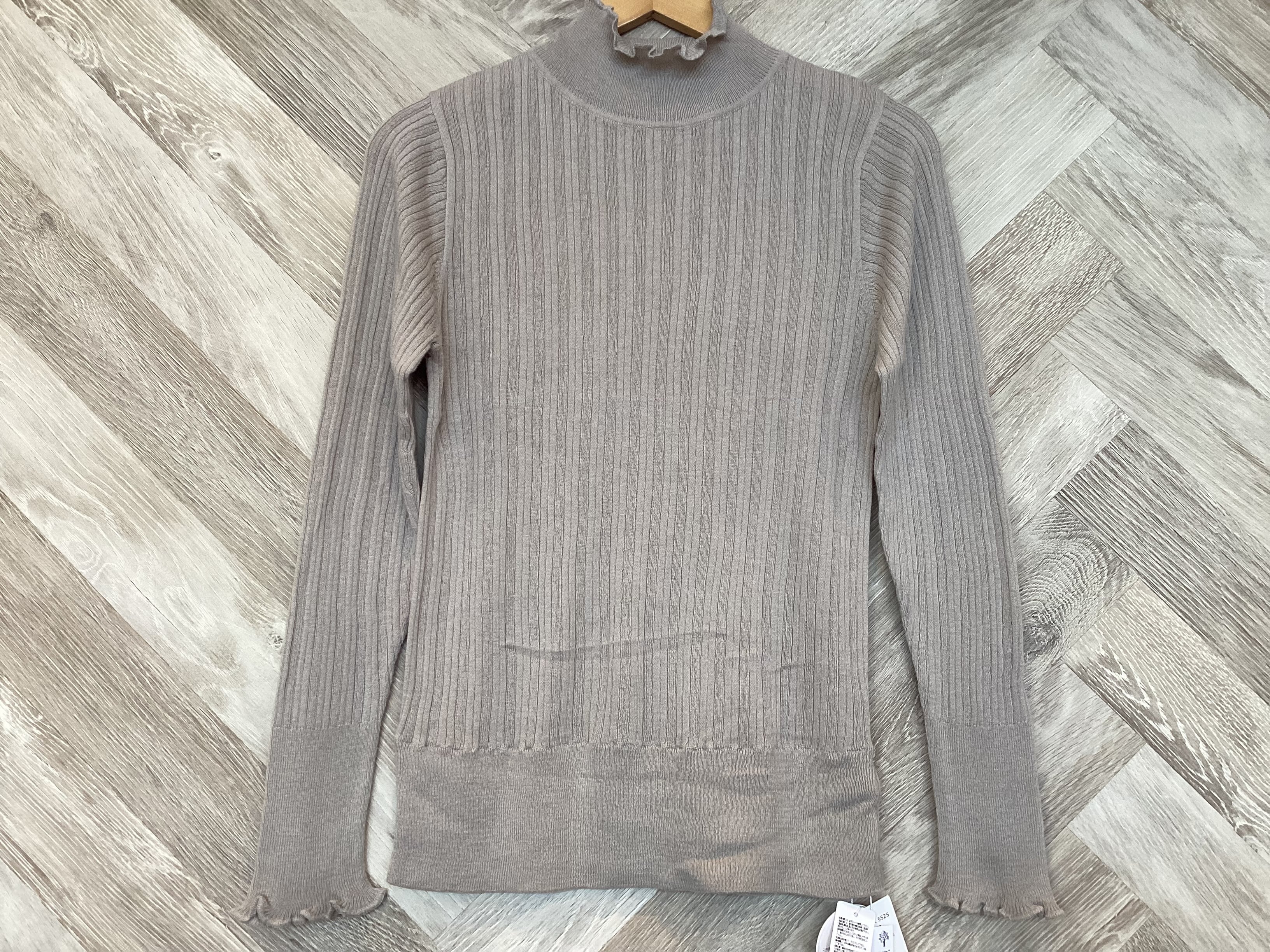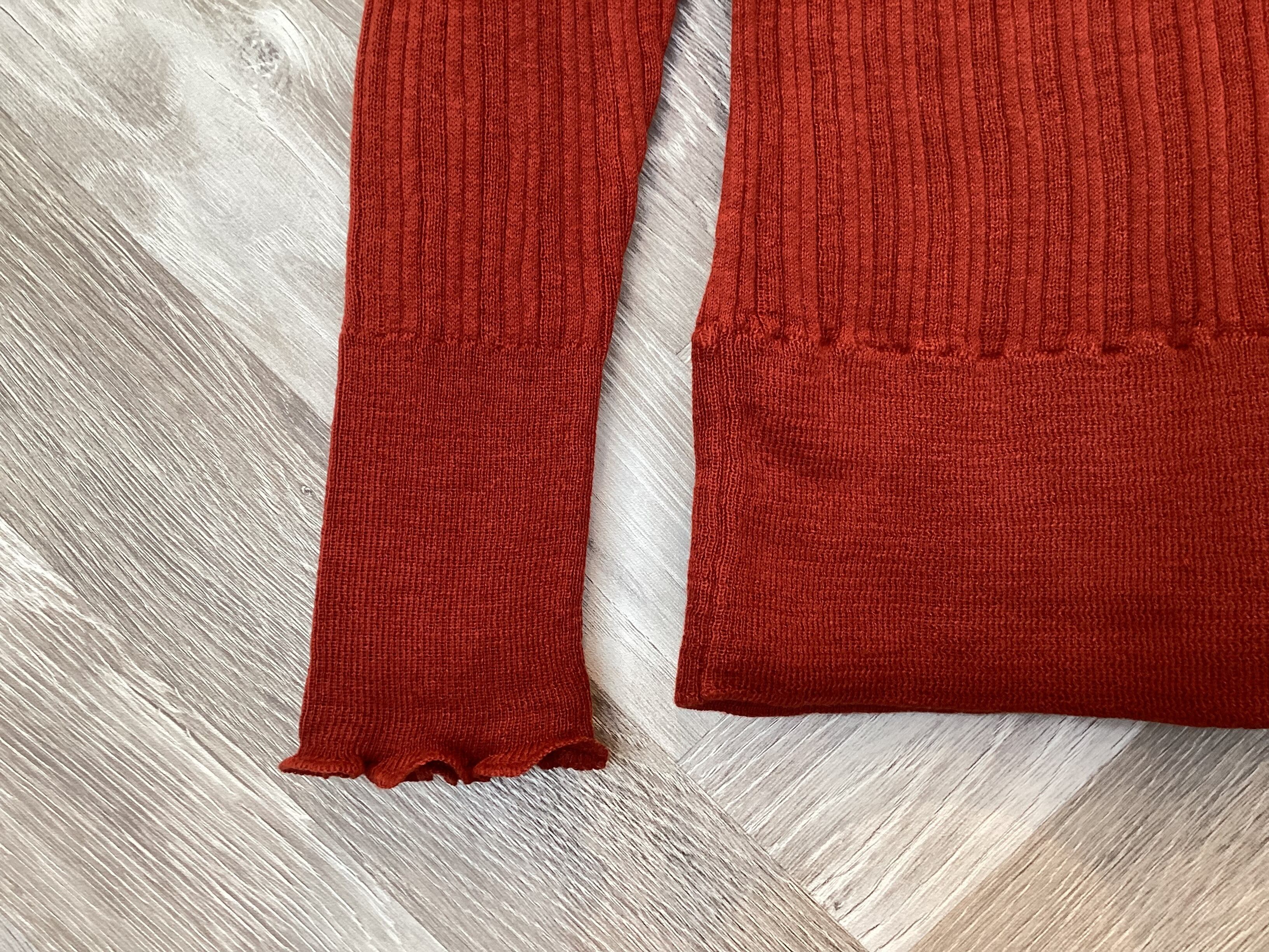 端のメロー始末がポイントの大人かわいいハイネックプルオーバーです