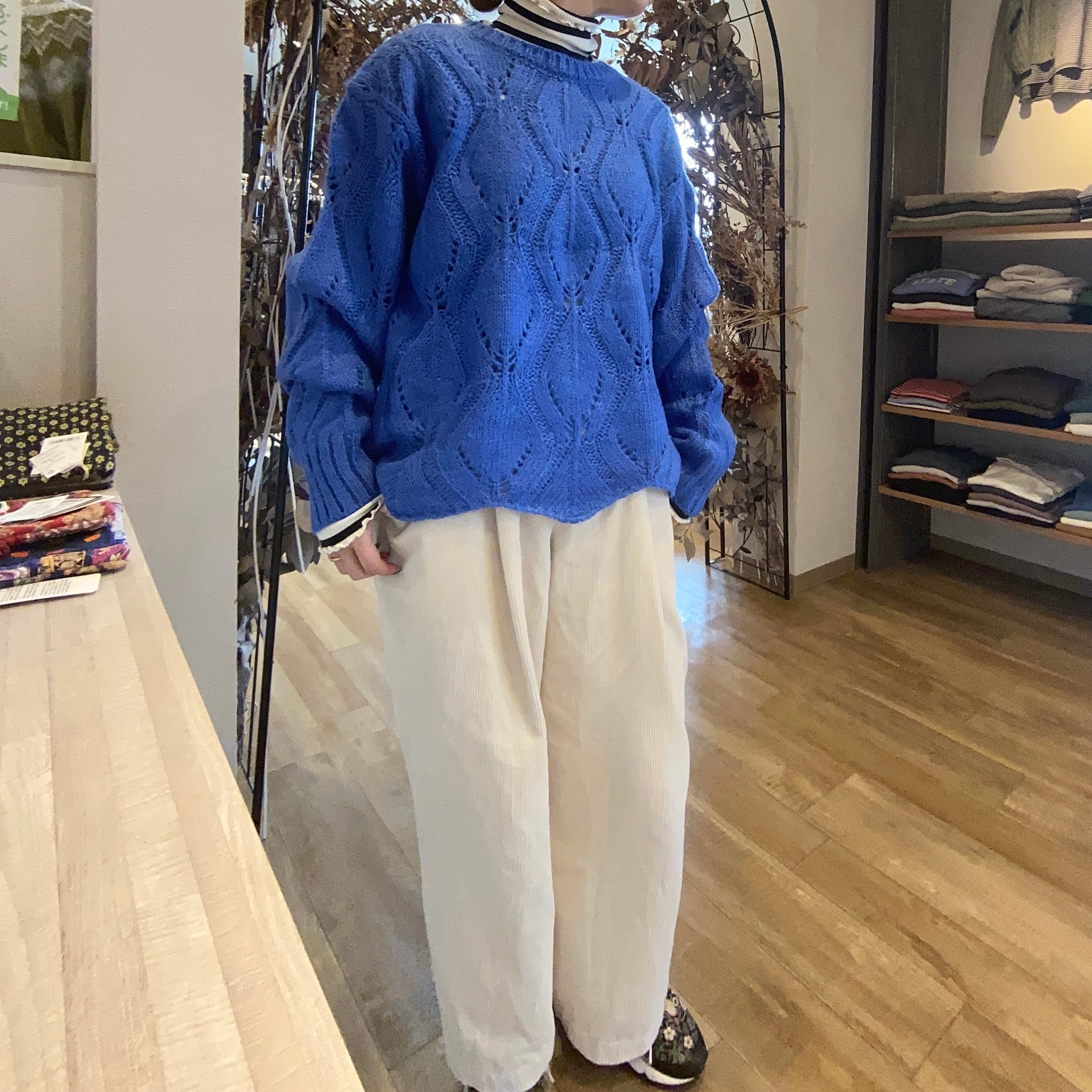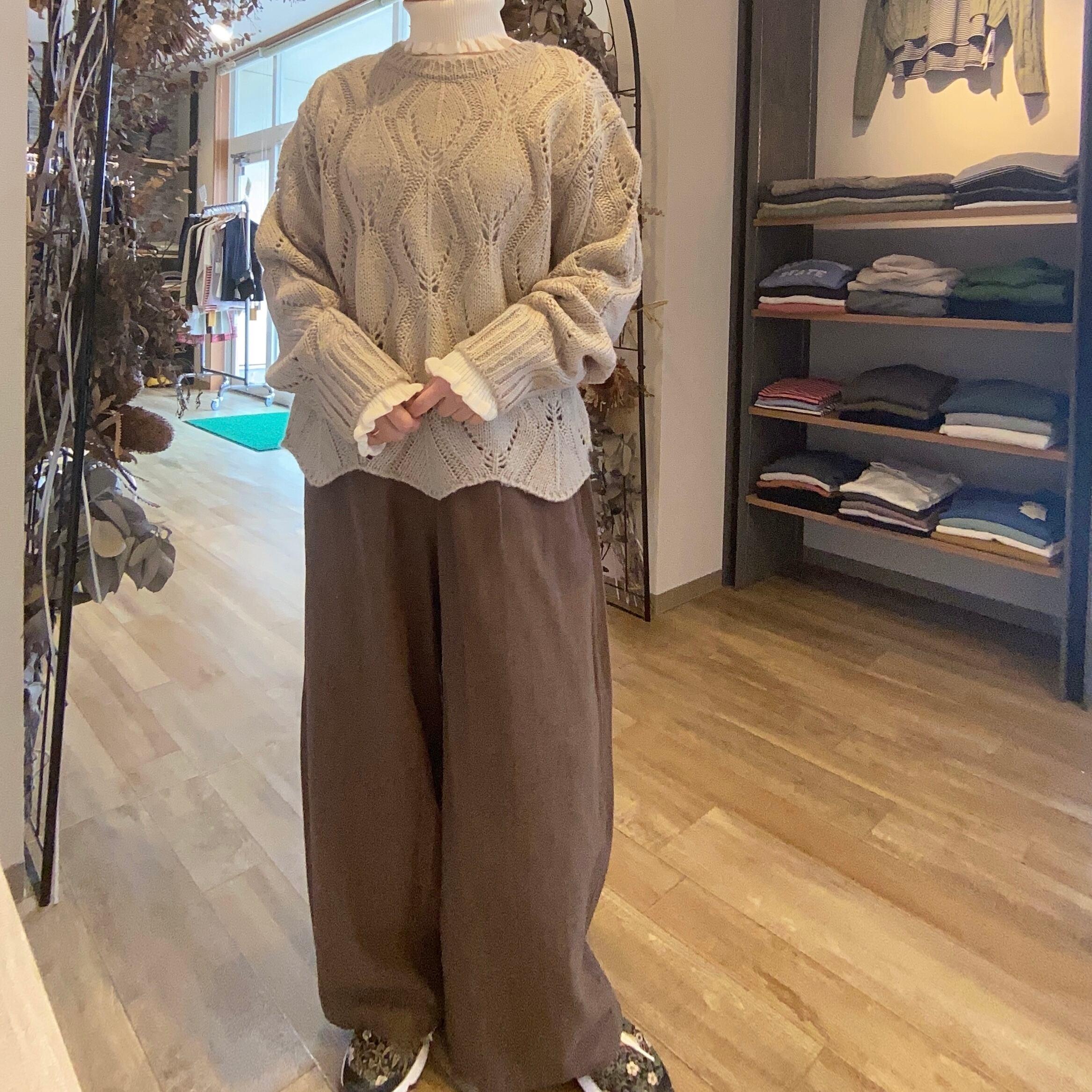 上品なナチュラル感とリラックスしたムードを兼ね備えたリーフ柄のニットプルオーバー