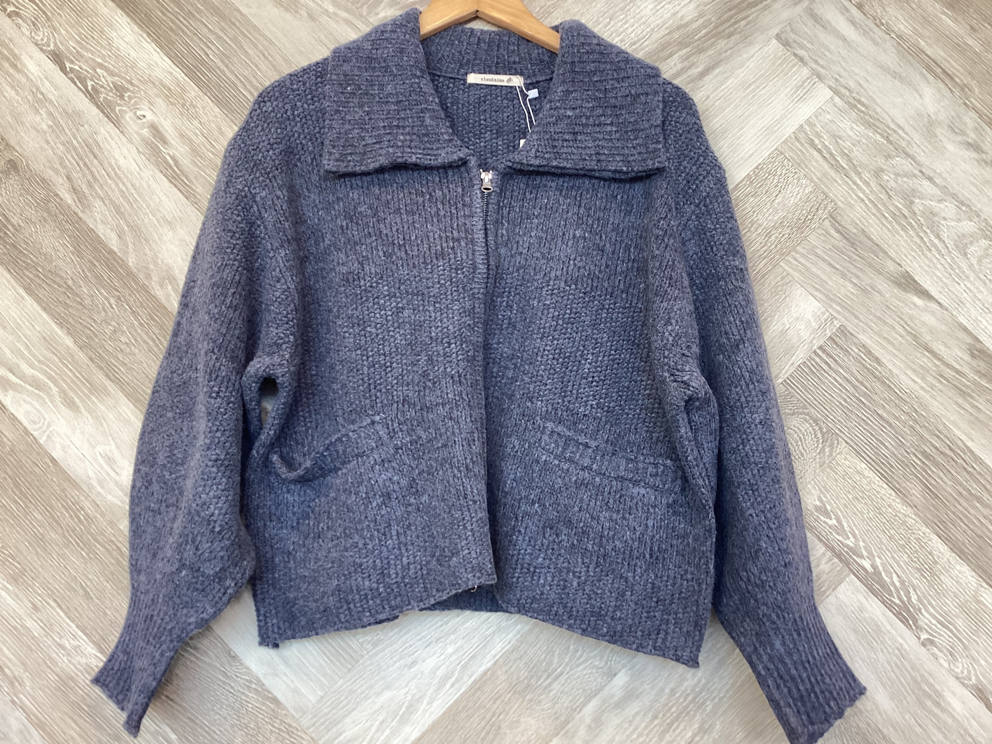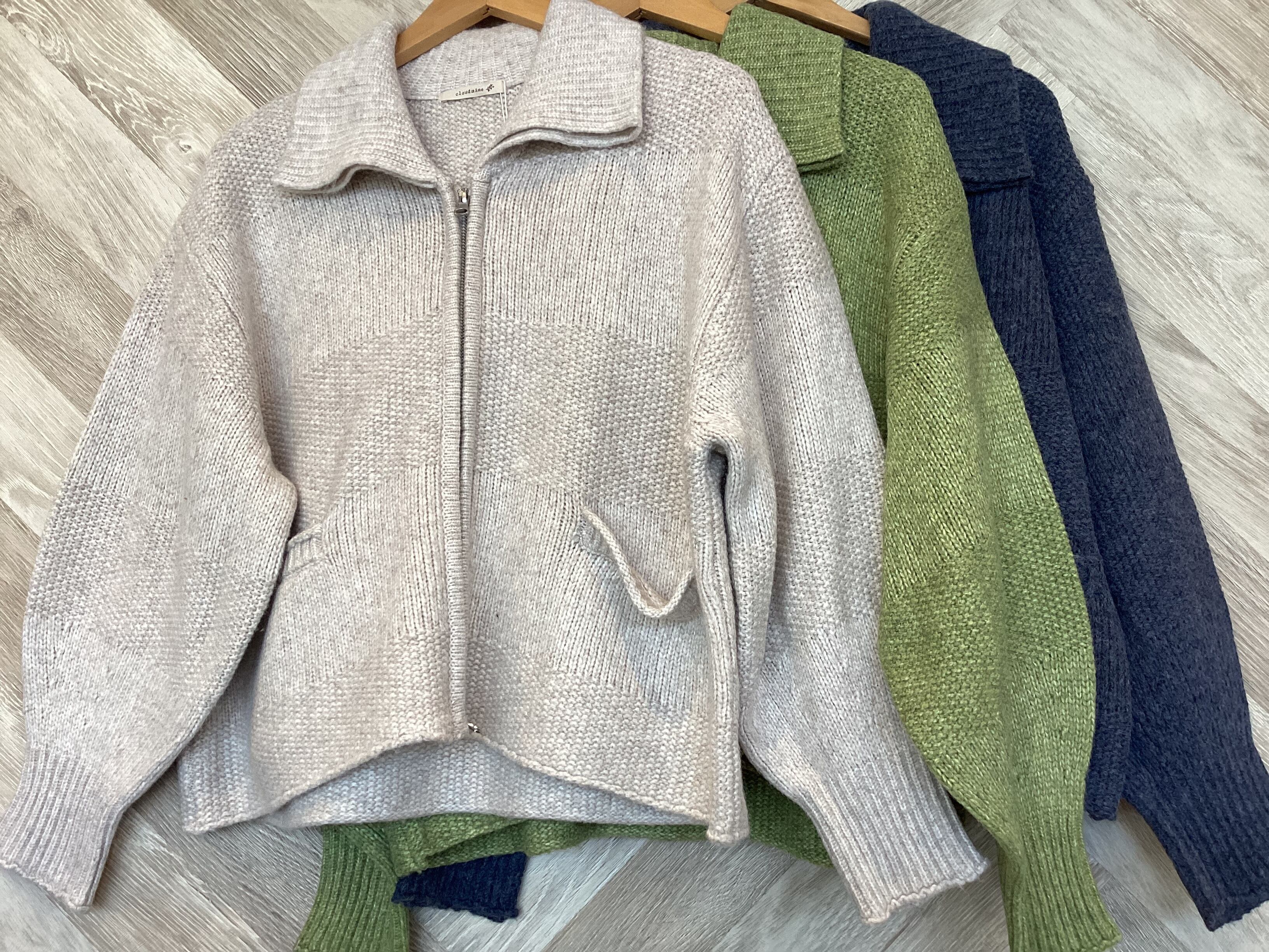 大きめの襟をつけて程よいボリューム感のあるダブルジップニットカーディガン