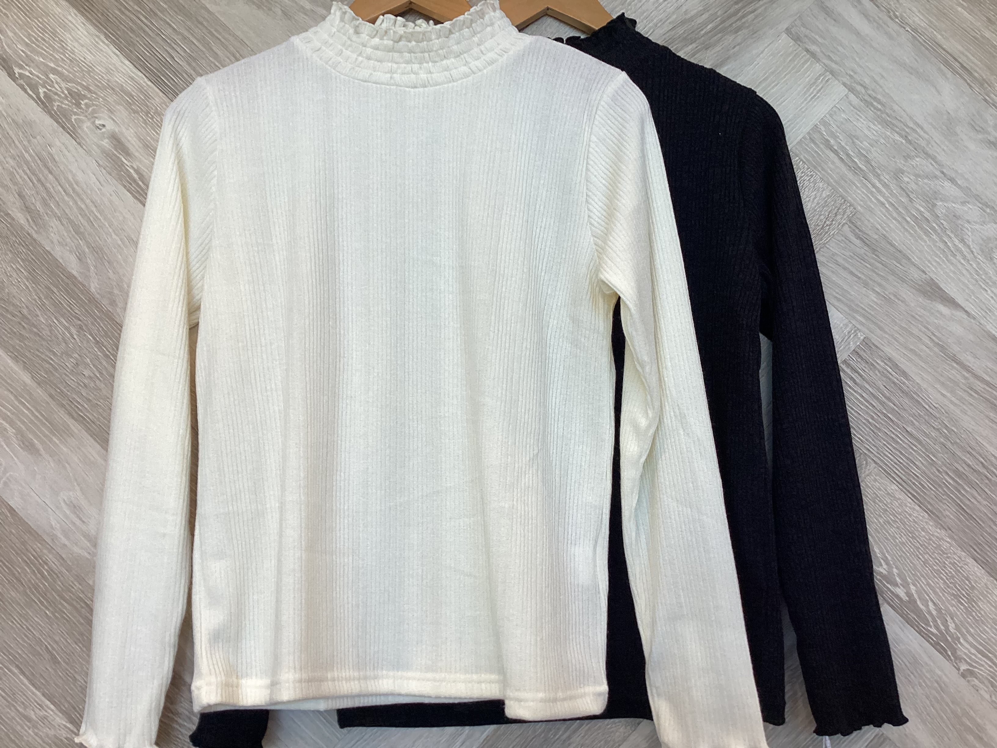 襟元はシャーリング仕様にすることでシンプルな中にもさり気ない可愛さをプラスしました