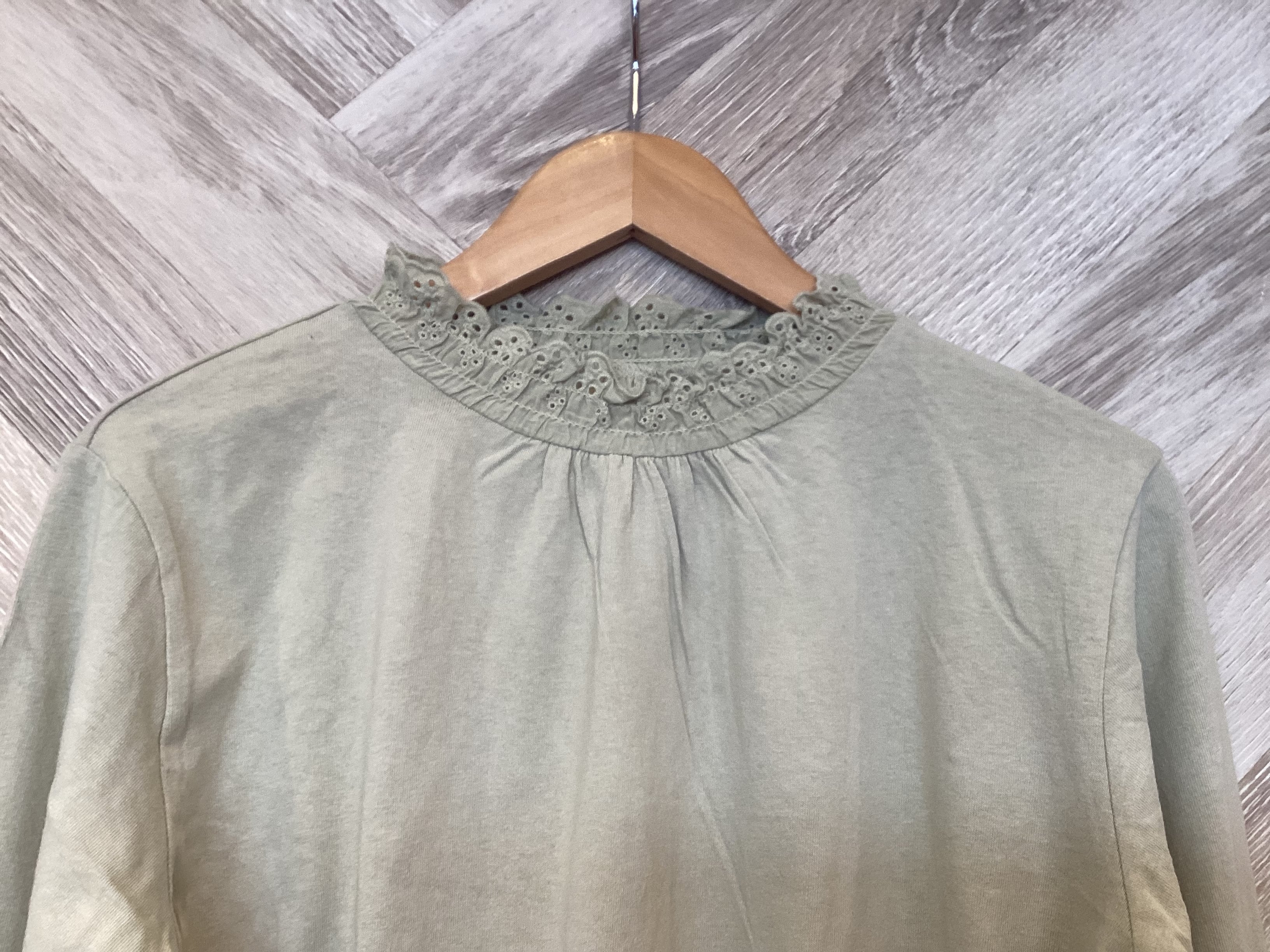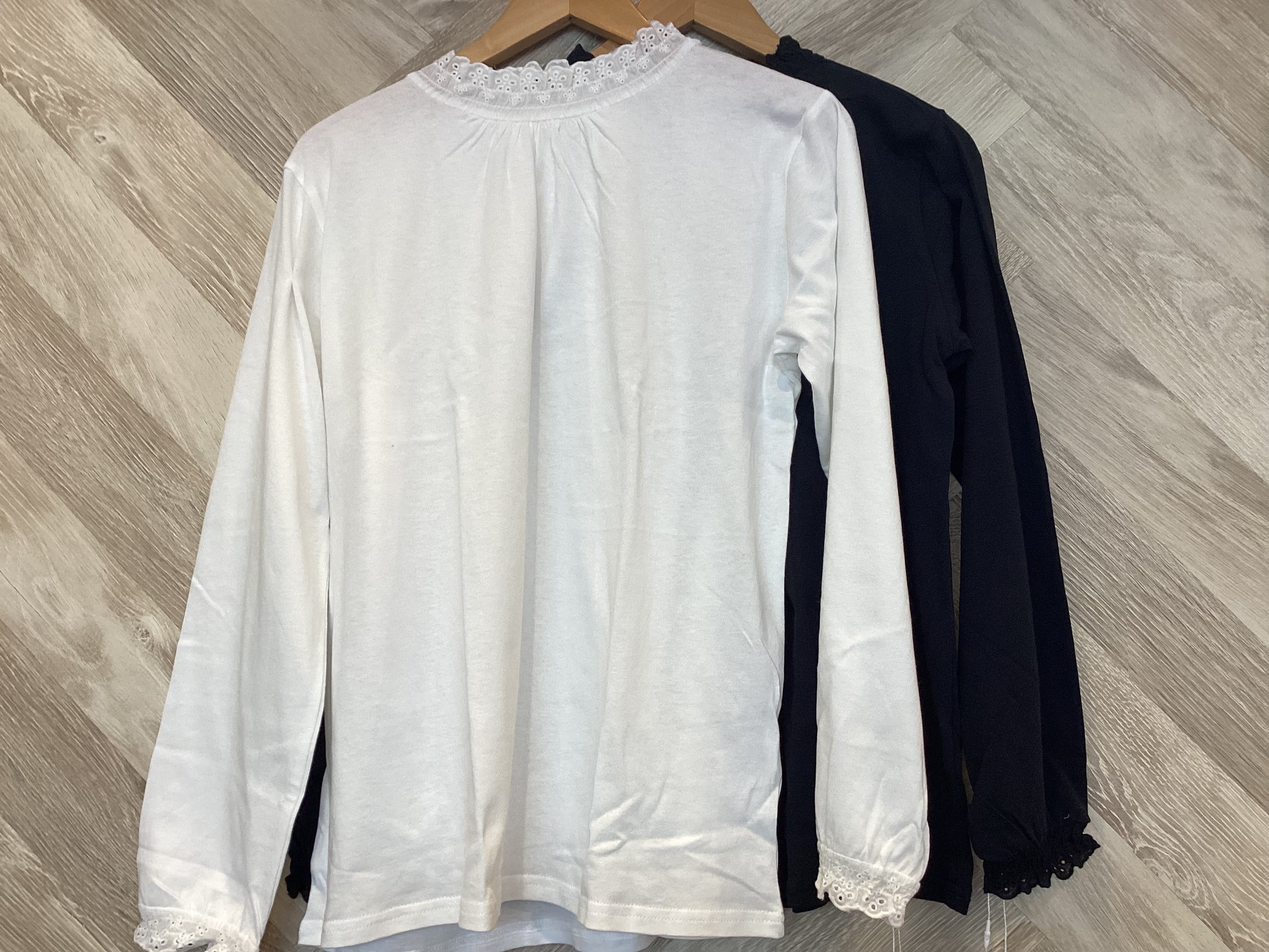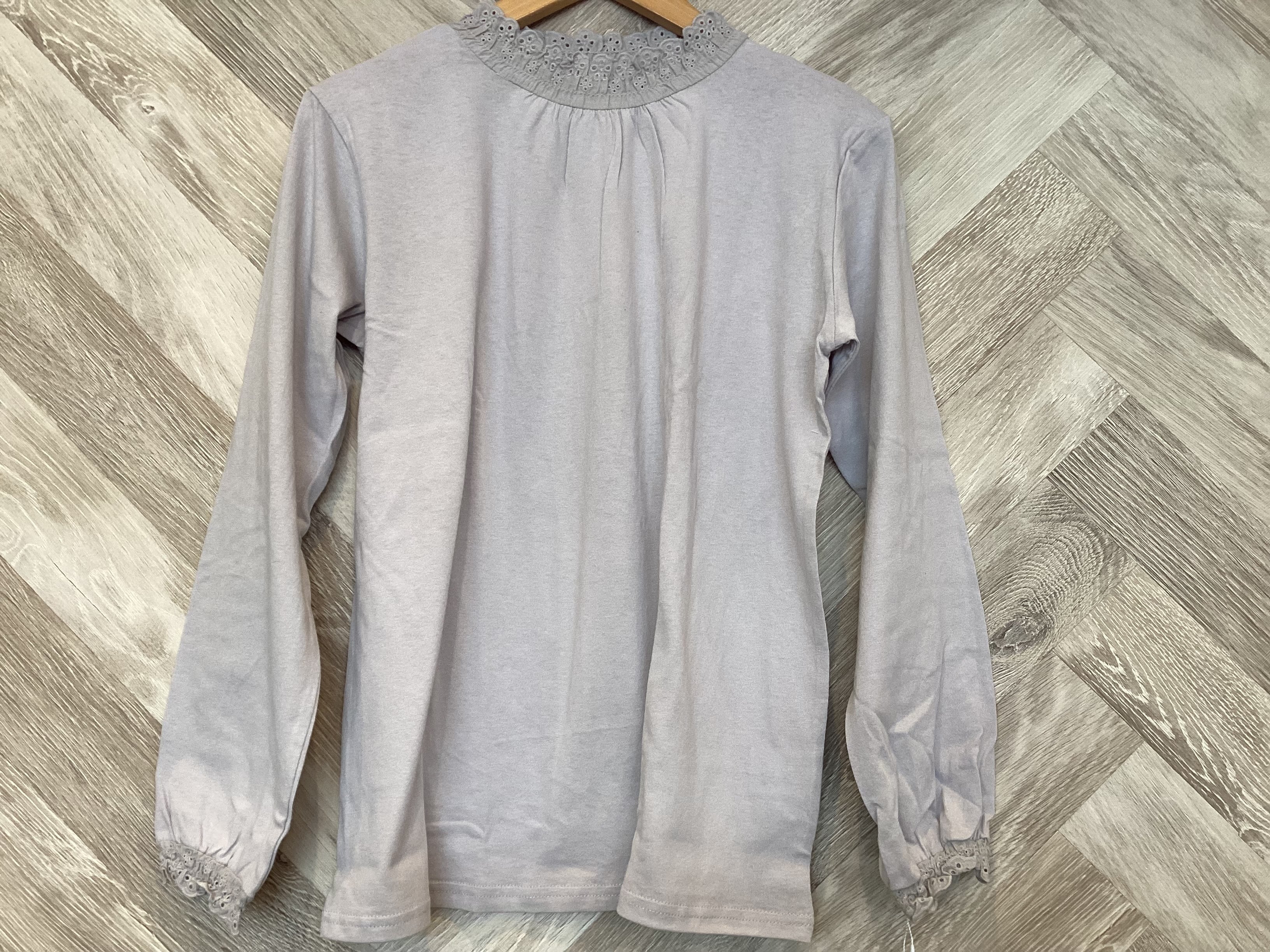 襟元と袖口にあしらったスカラップレースが程よく甘さを添えてデイリーに馴染んでくれます