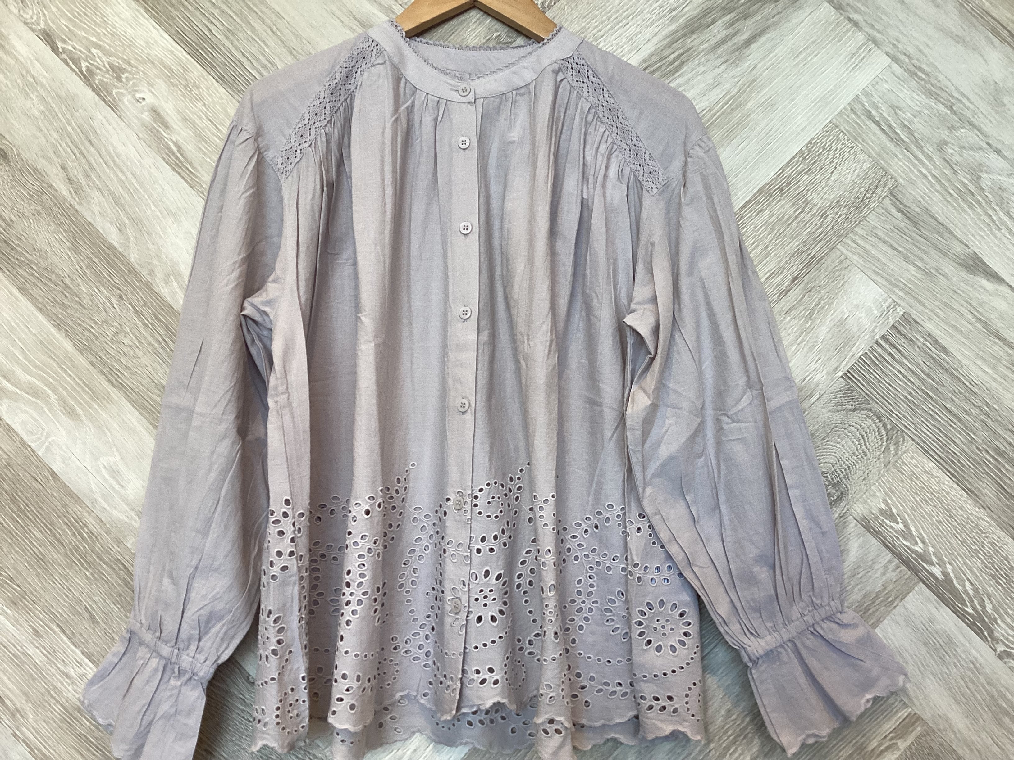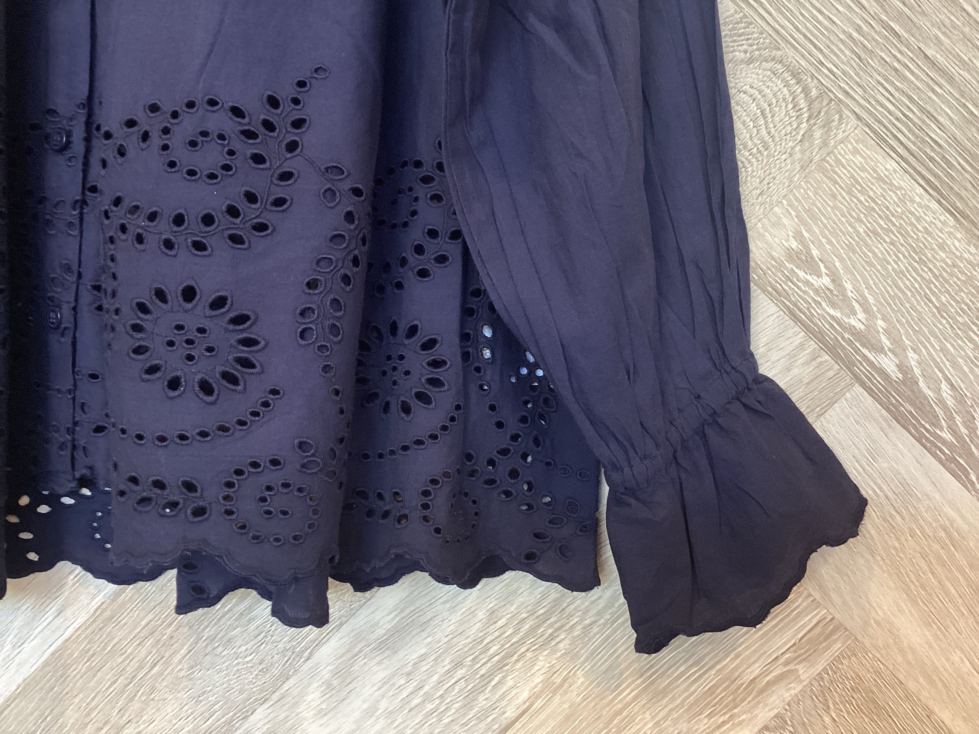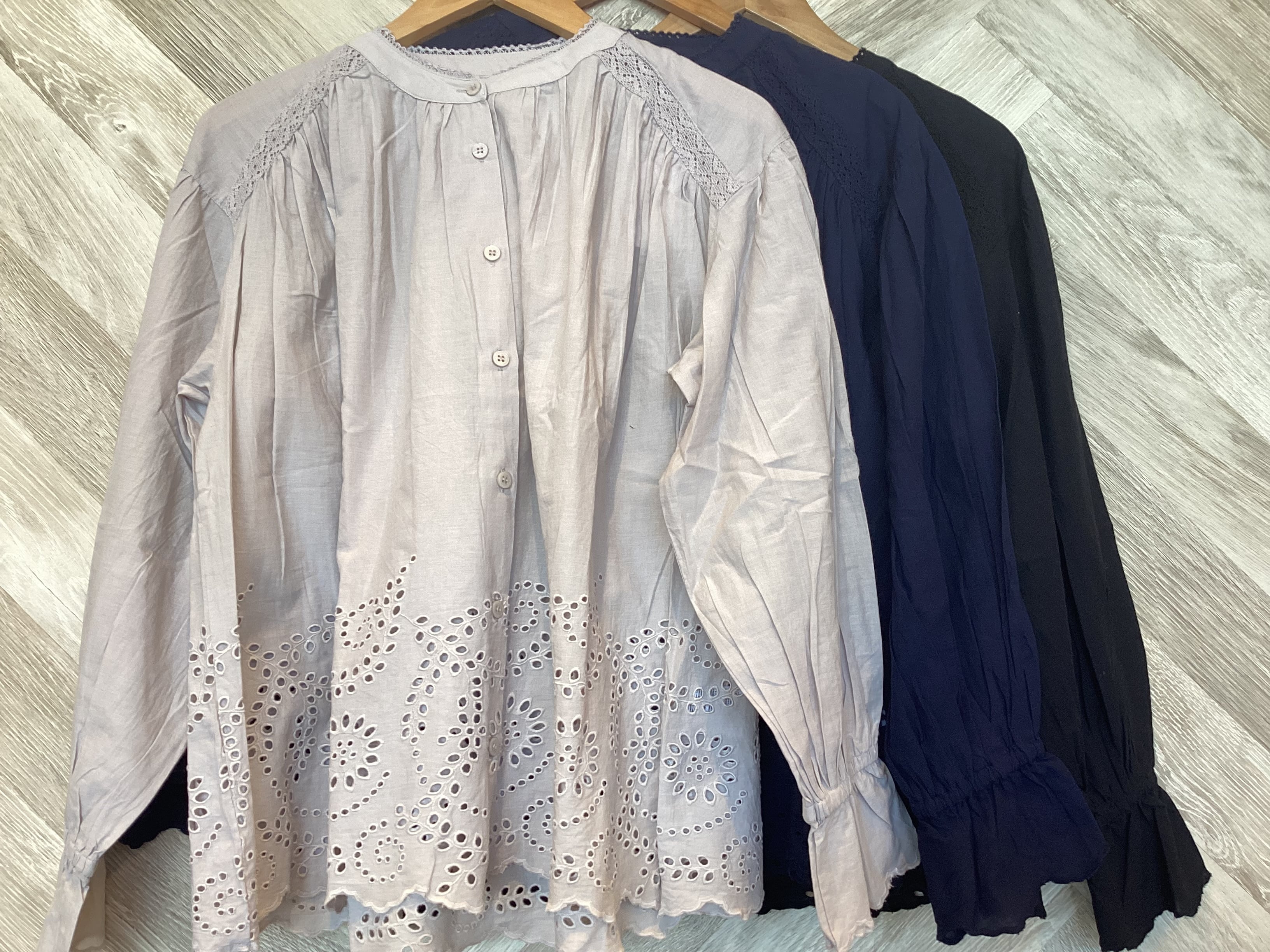 シフリー刺繍&袖口スカラップ前開きブラウス