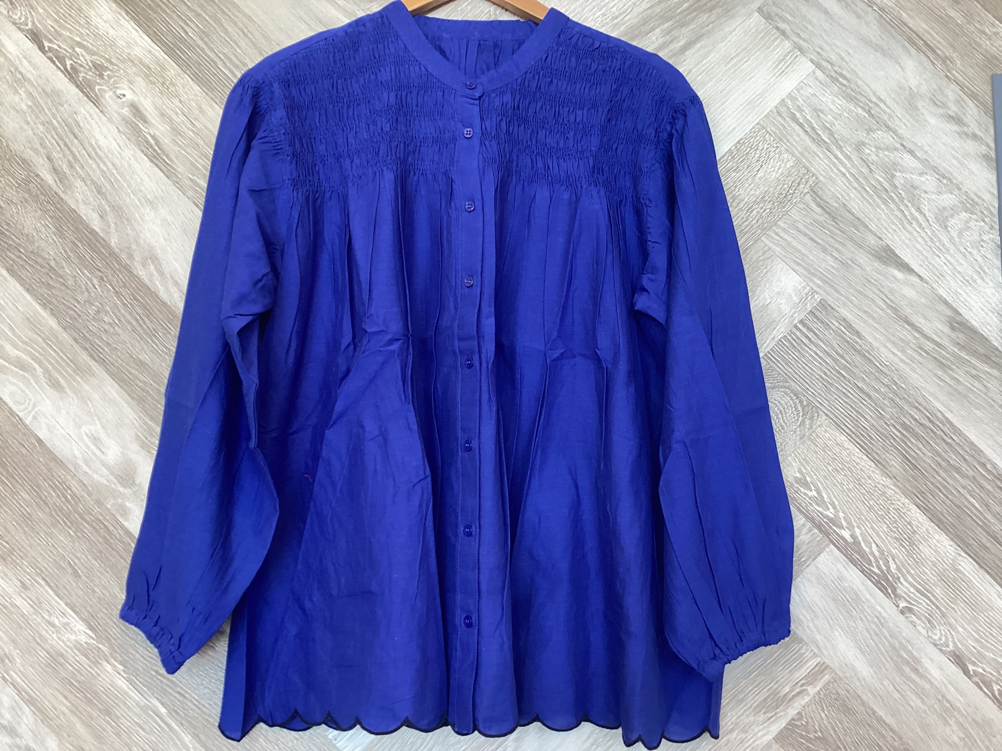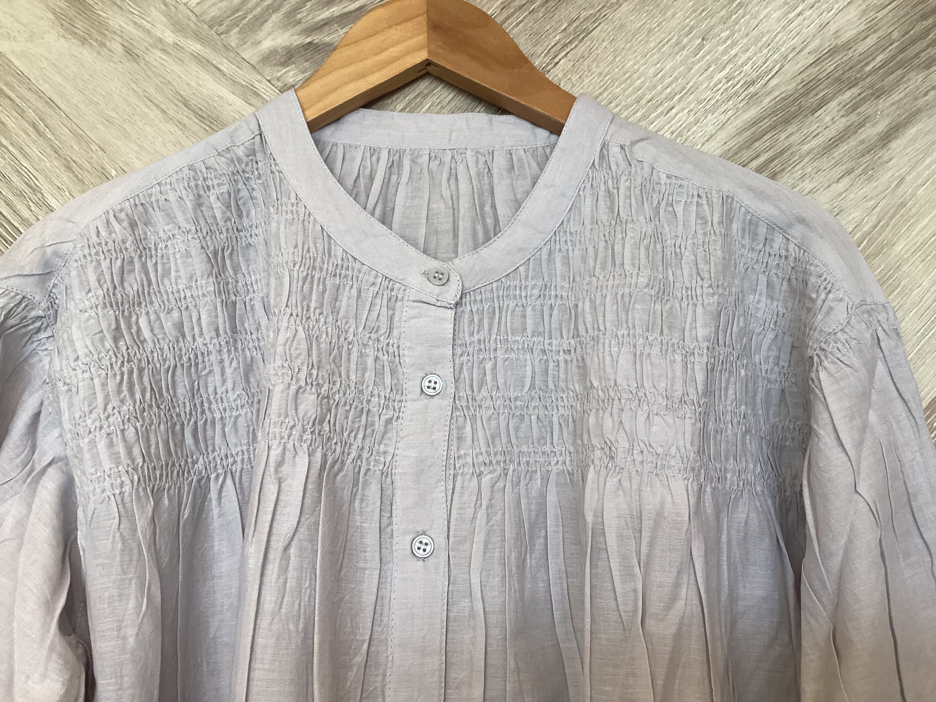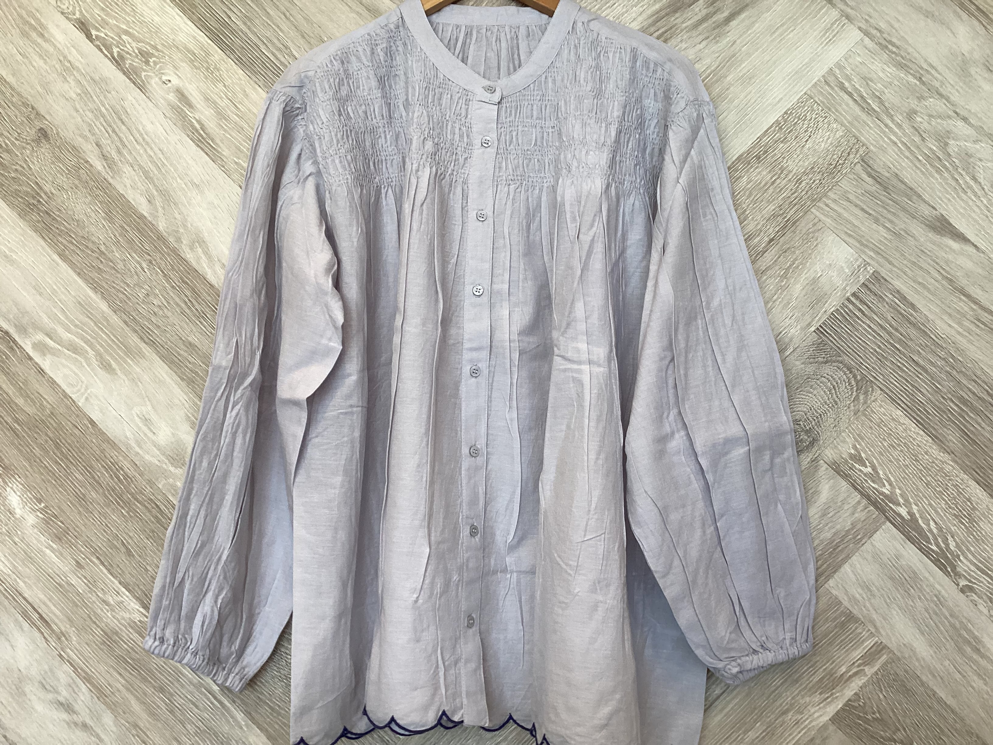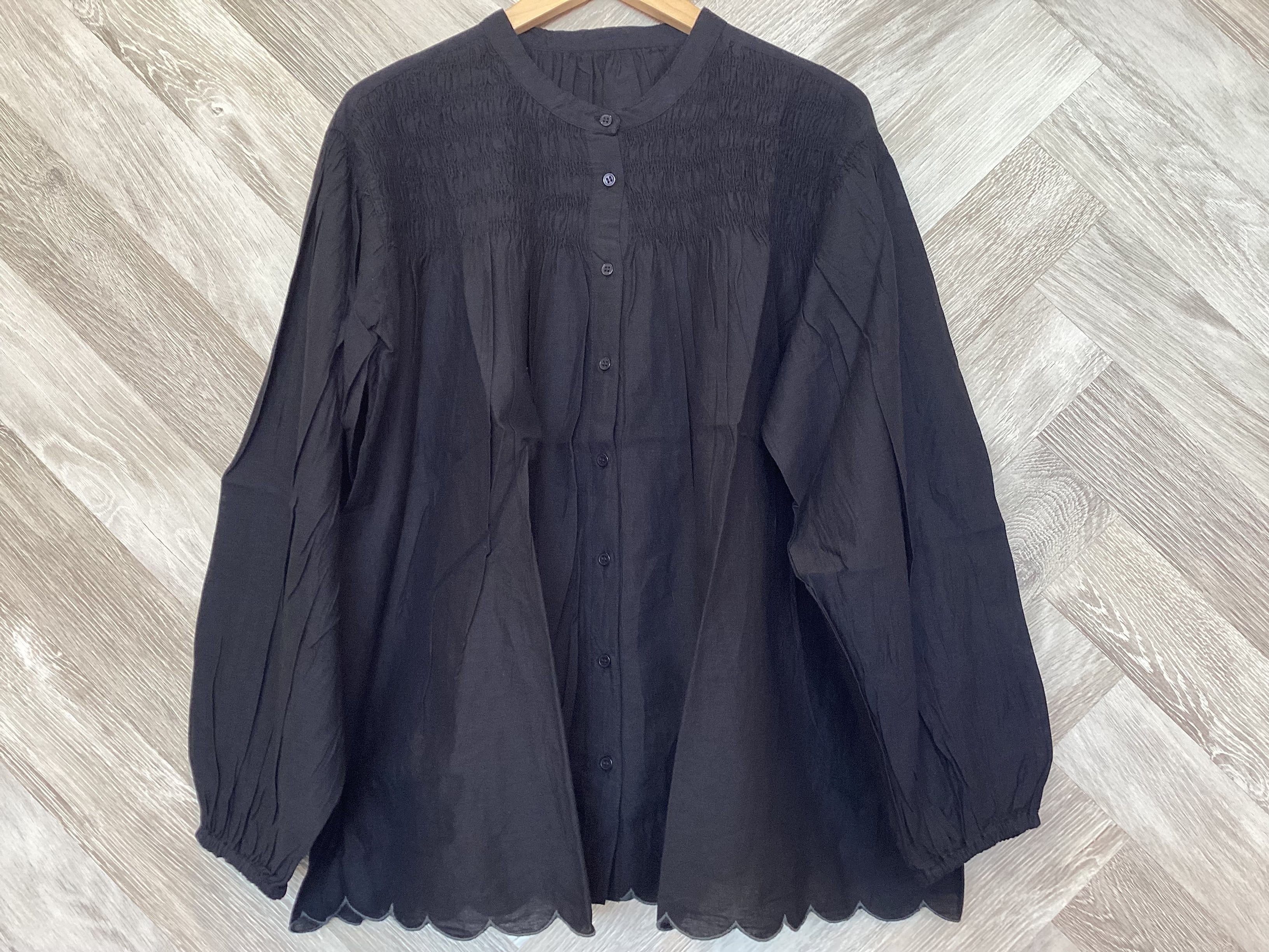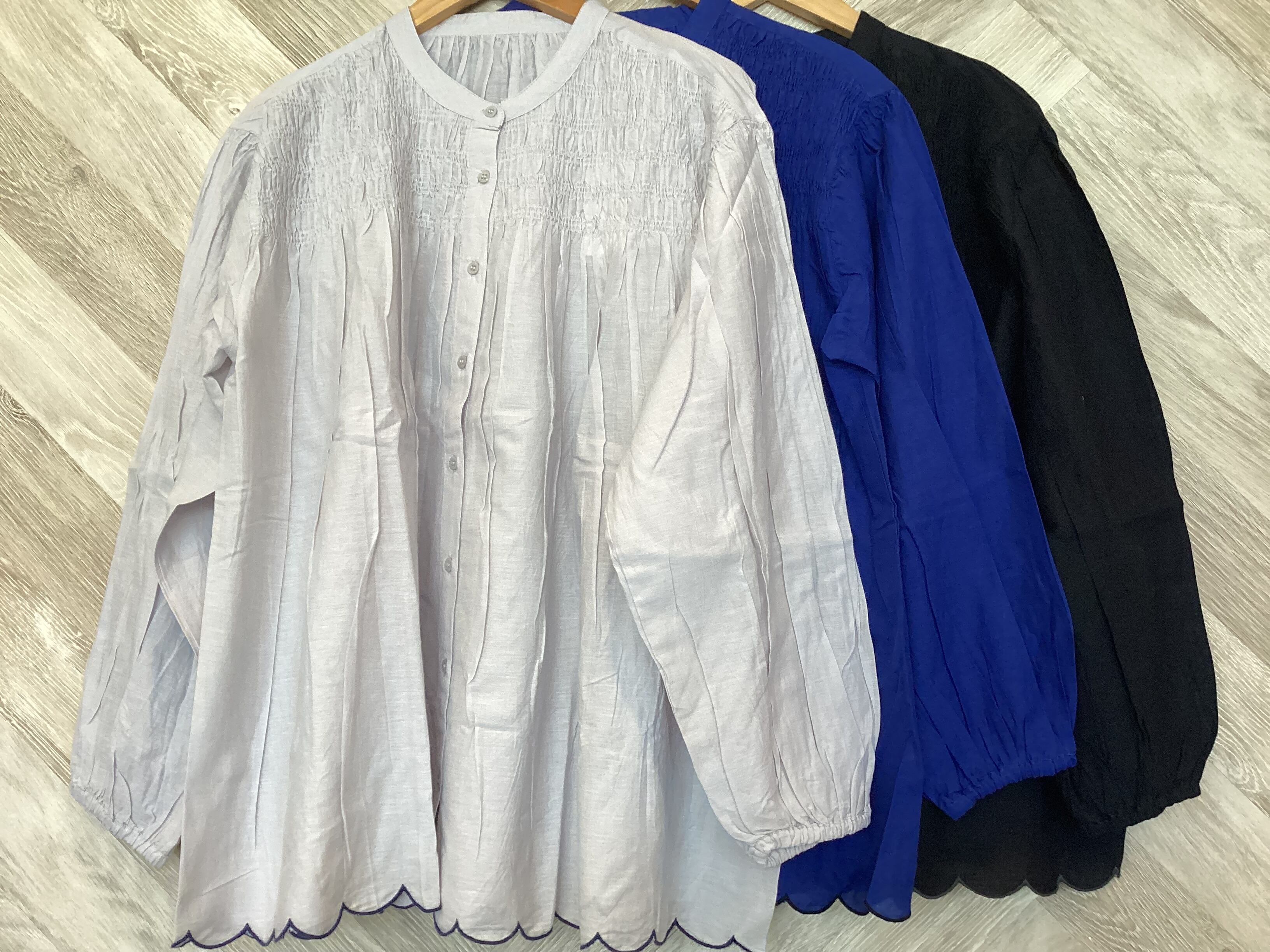 胸元シャーリング裾スカラップブラウス