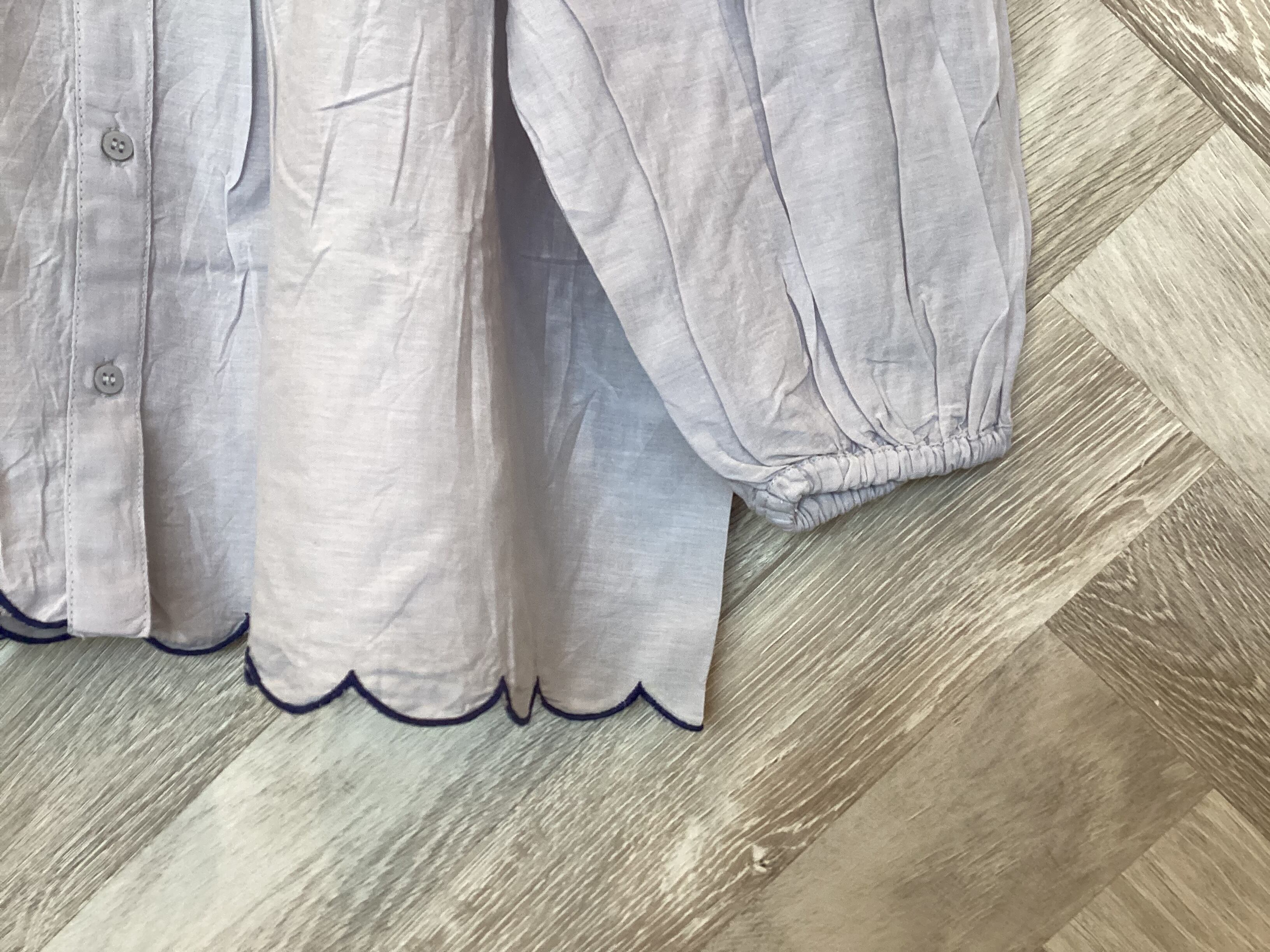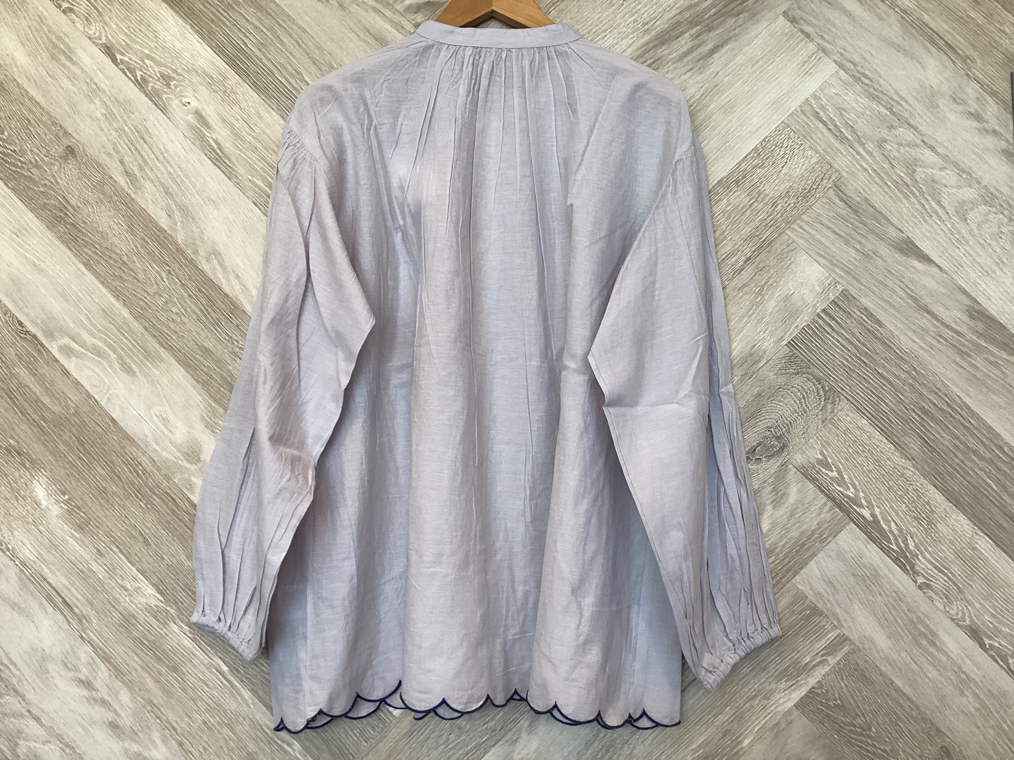 裾に施されたスカラップデザインと配色刺繍が魅力のブラウス