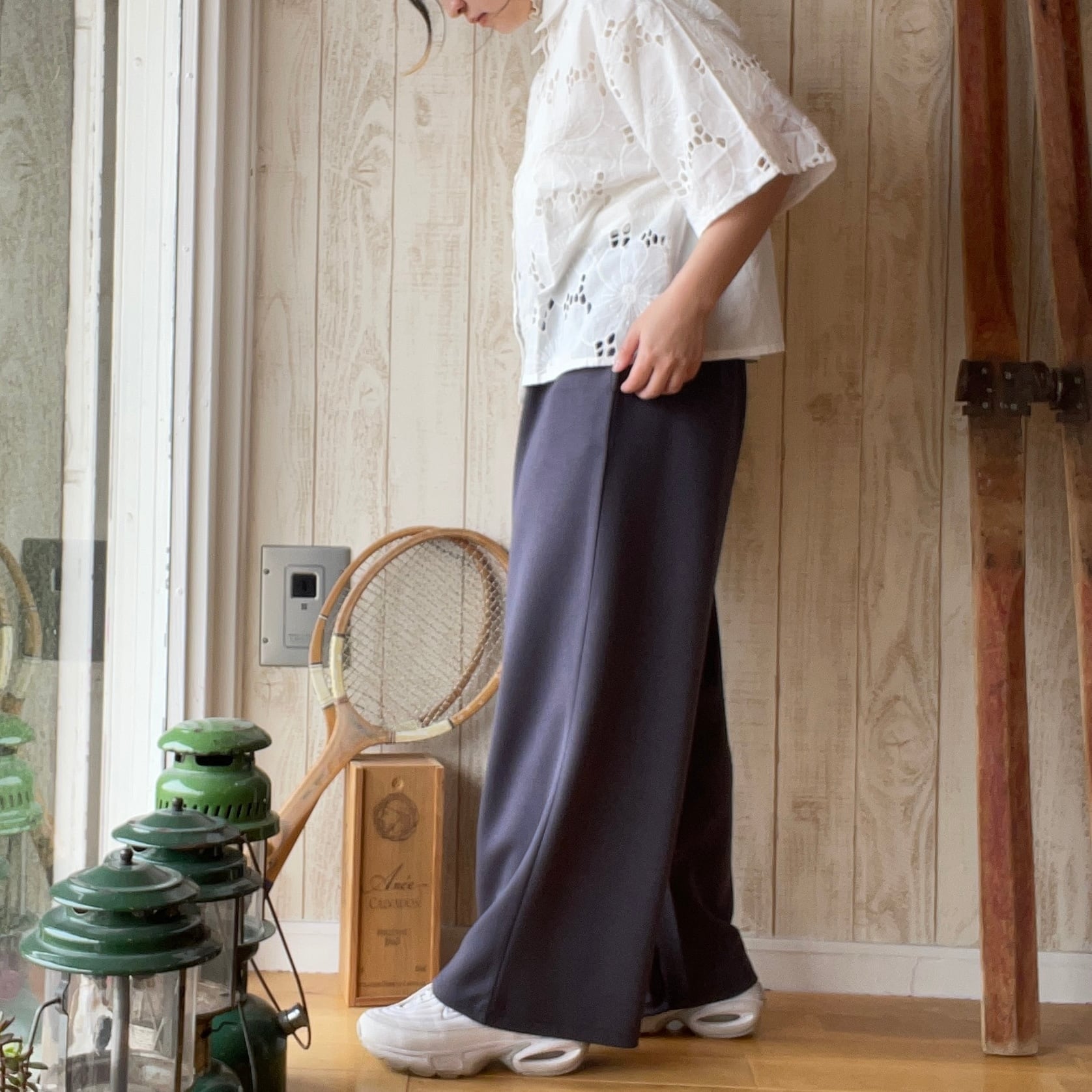 更に肘まで隠れる5分袖は気になる二の腕をさりげなくカバーしながら涼しげな印象をキープ