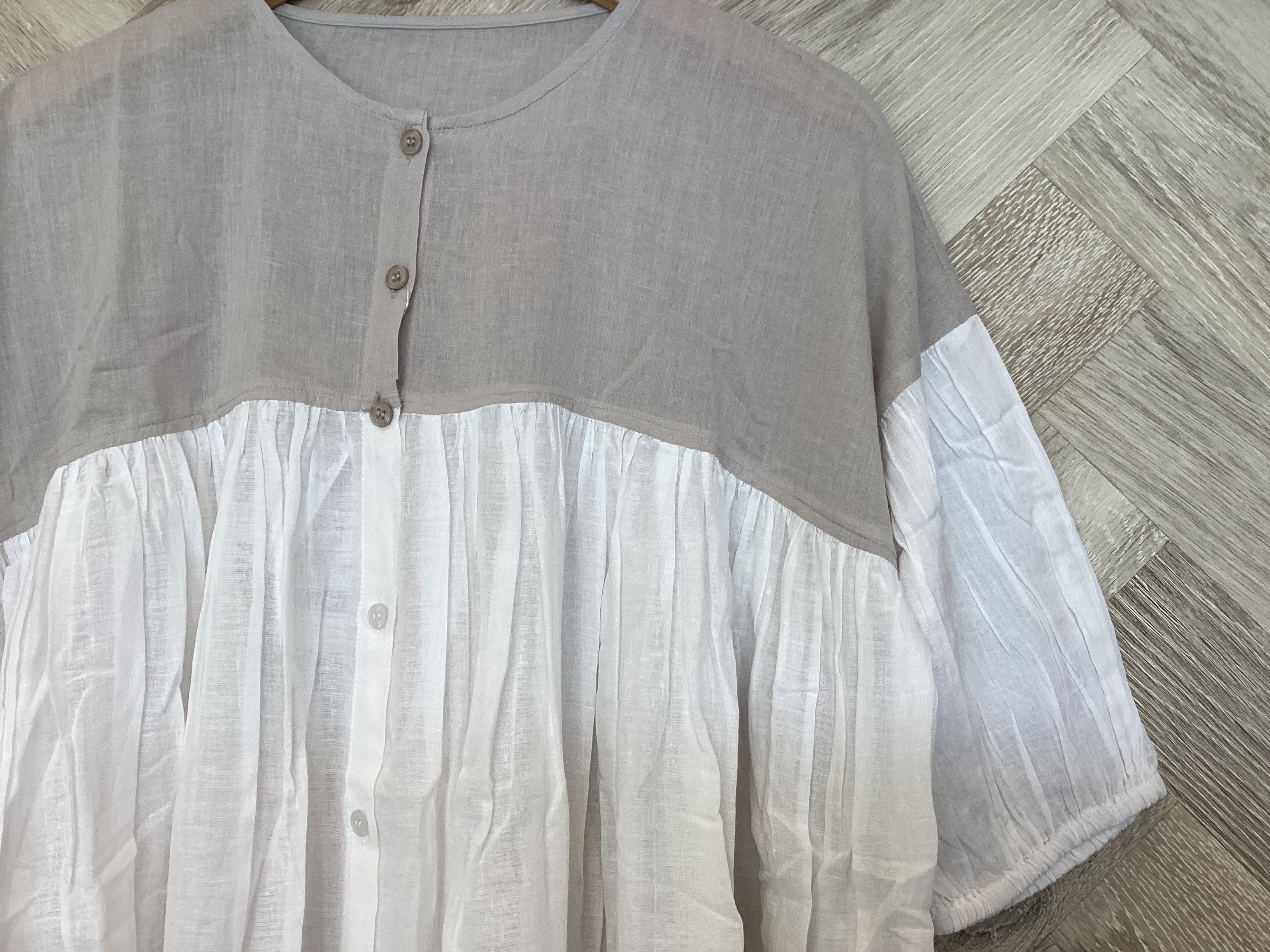 身頃の切り替えにはギャザーがたっぷり入ってるのでふんわりとしたボリュームの柔らかい印象を与えます