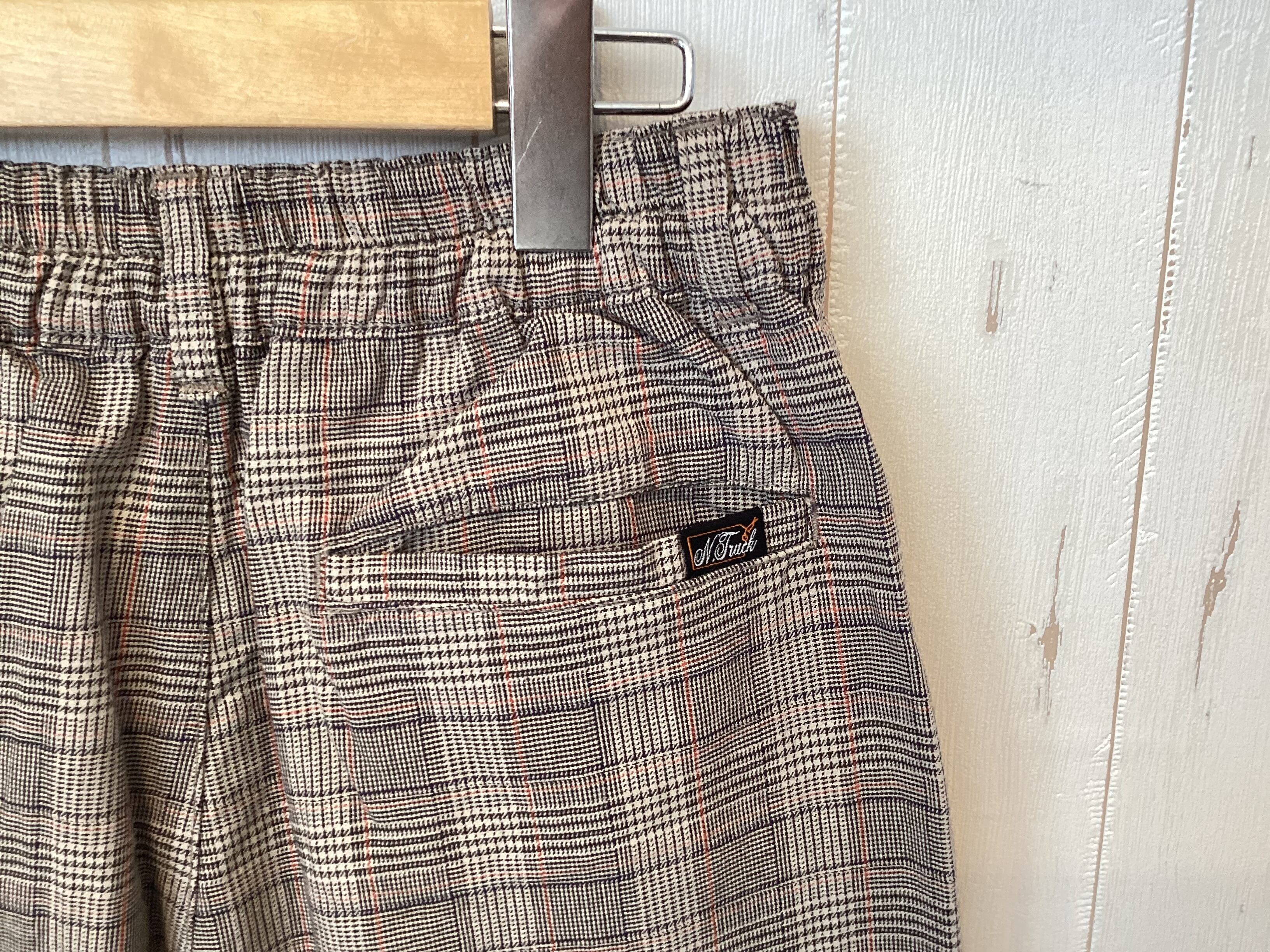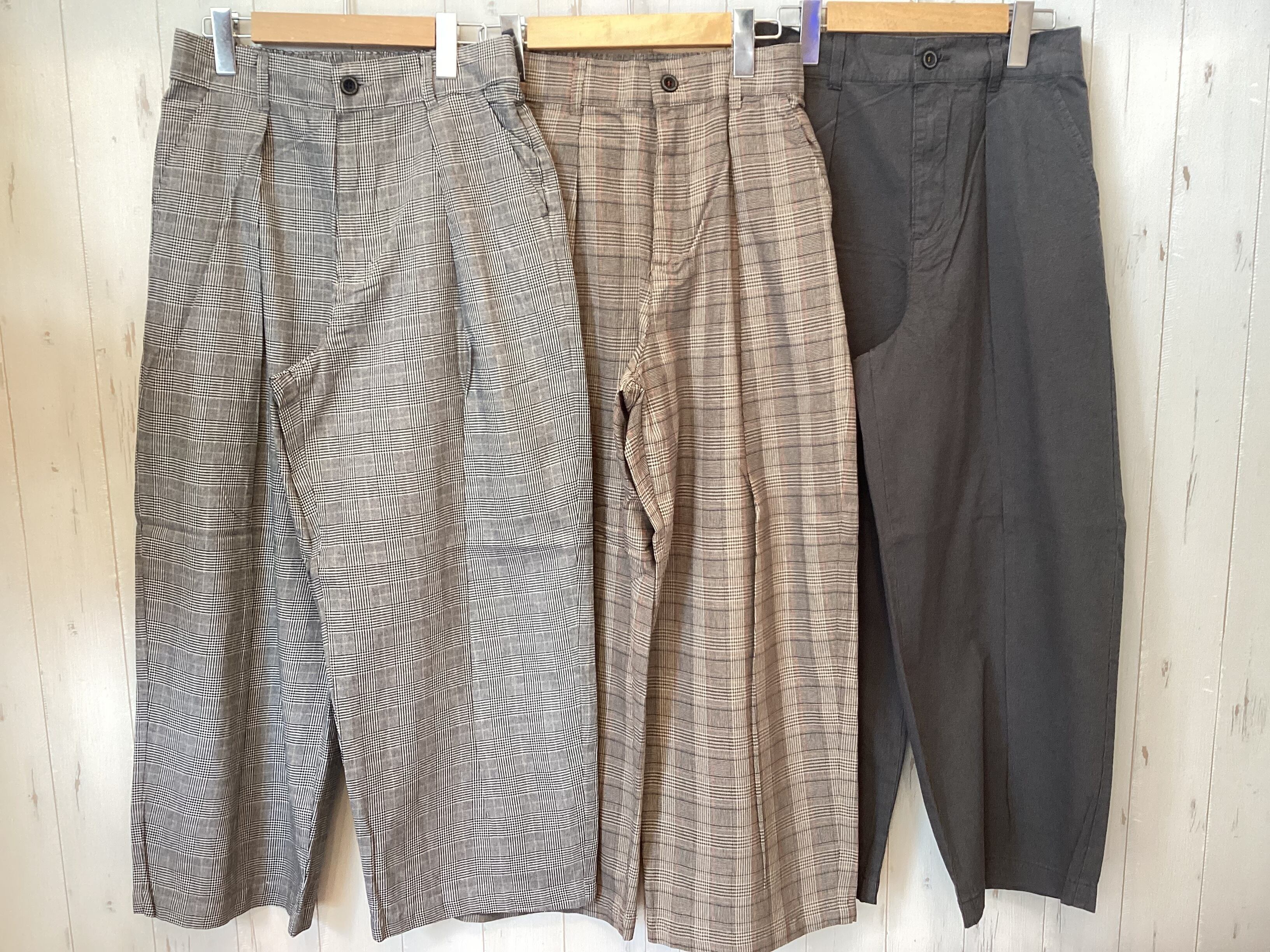 大胆なタックが入ったパンツはカジュアルからお出かけまで履いていただける柄とカラーリングです