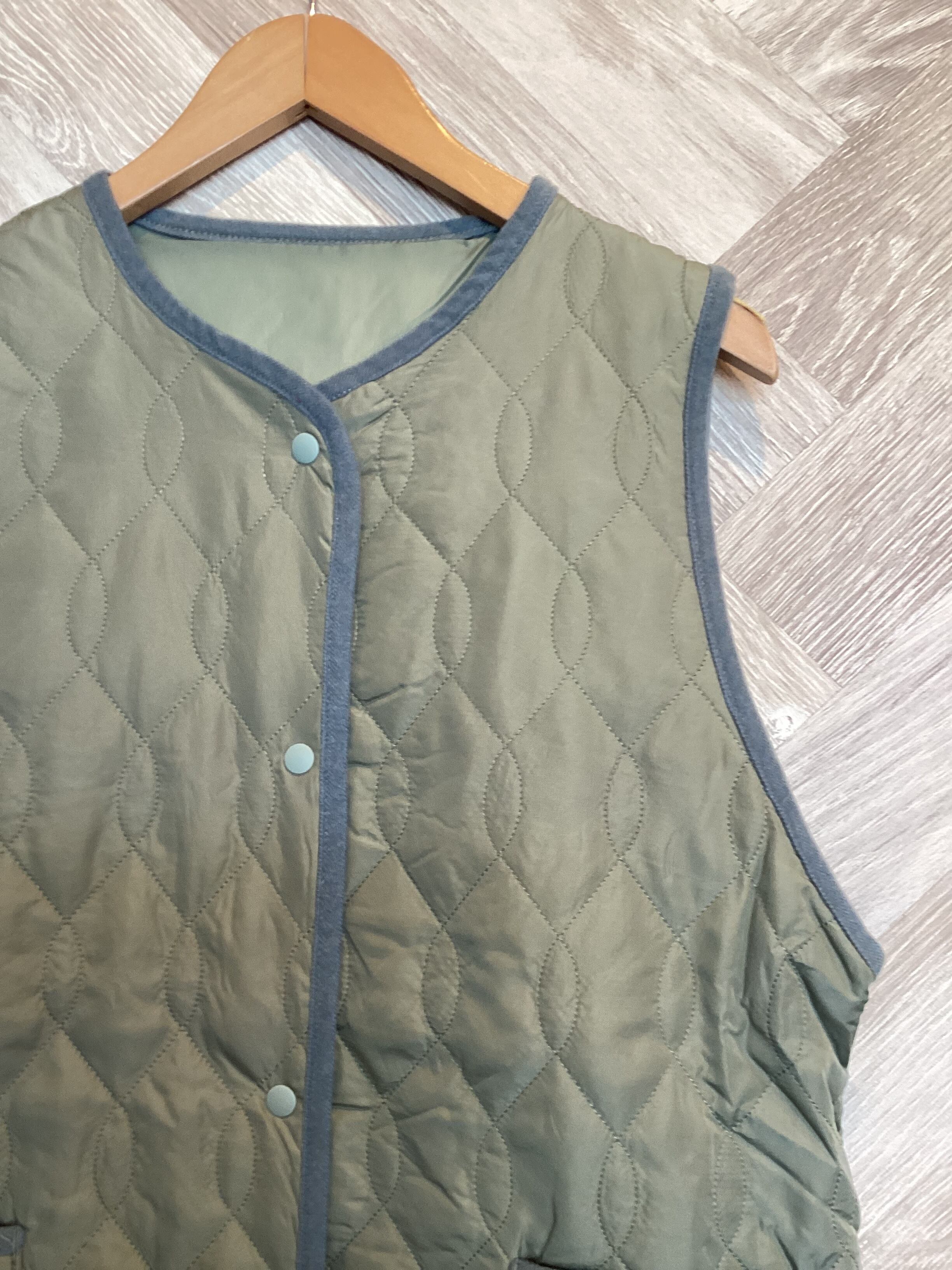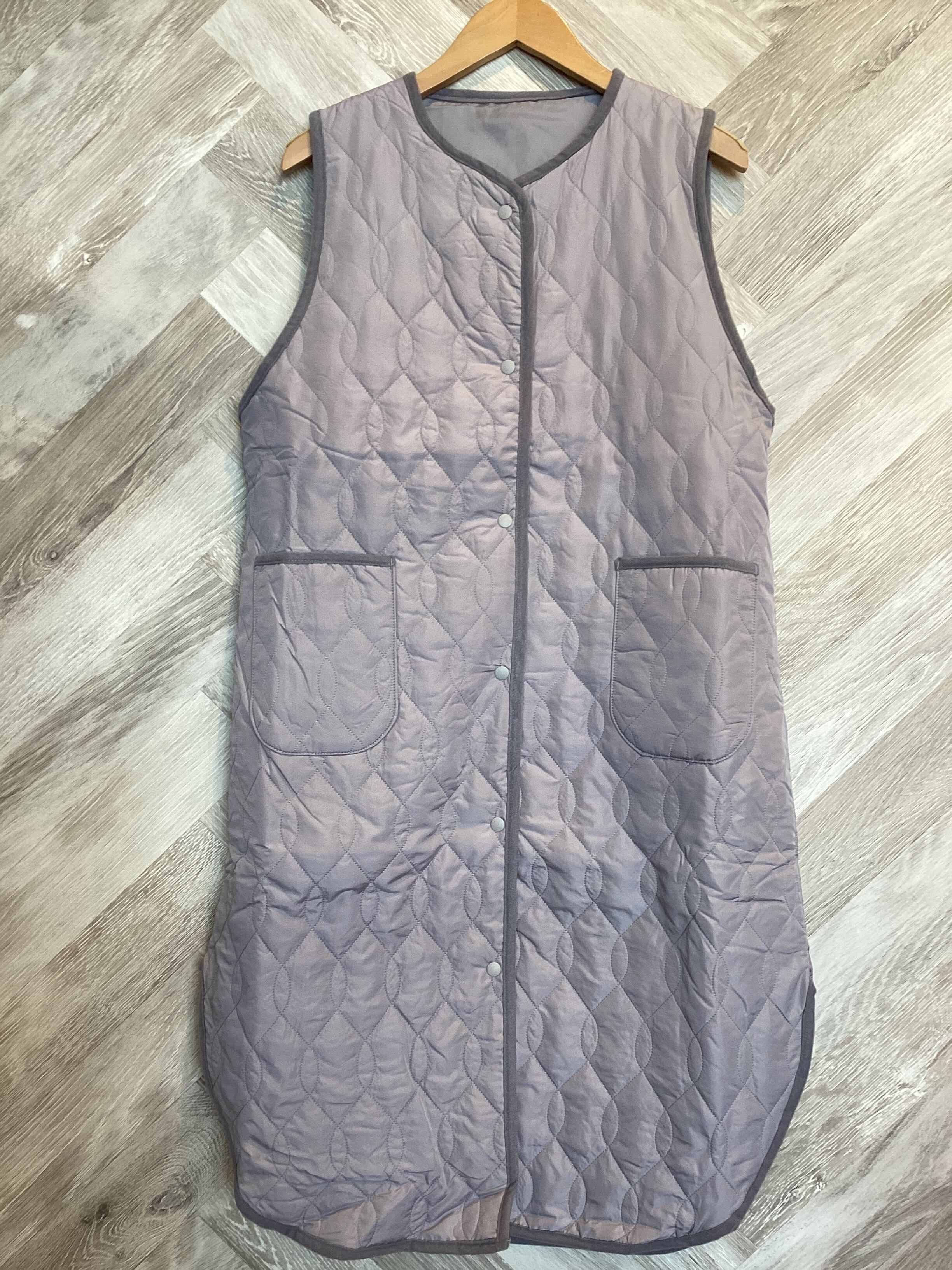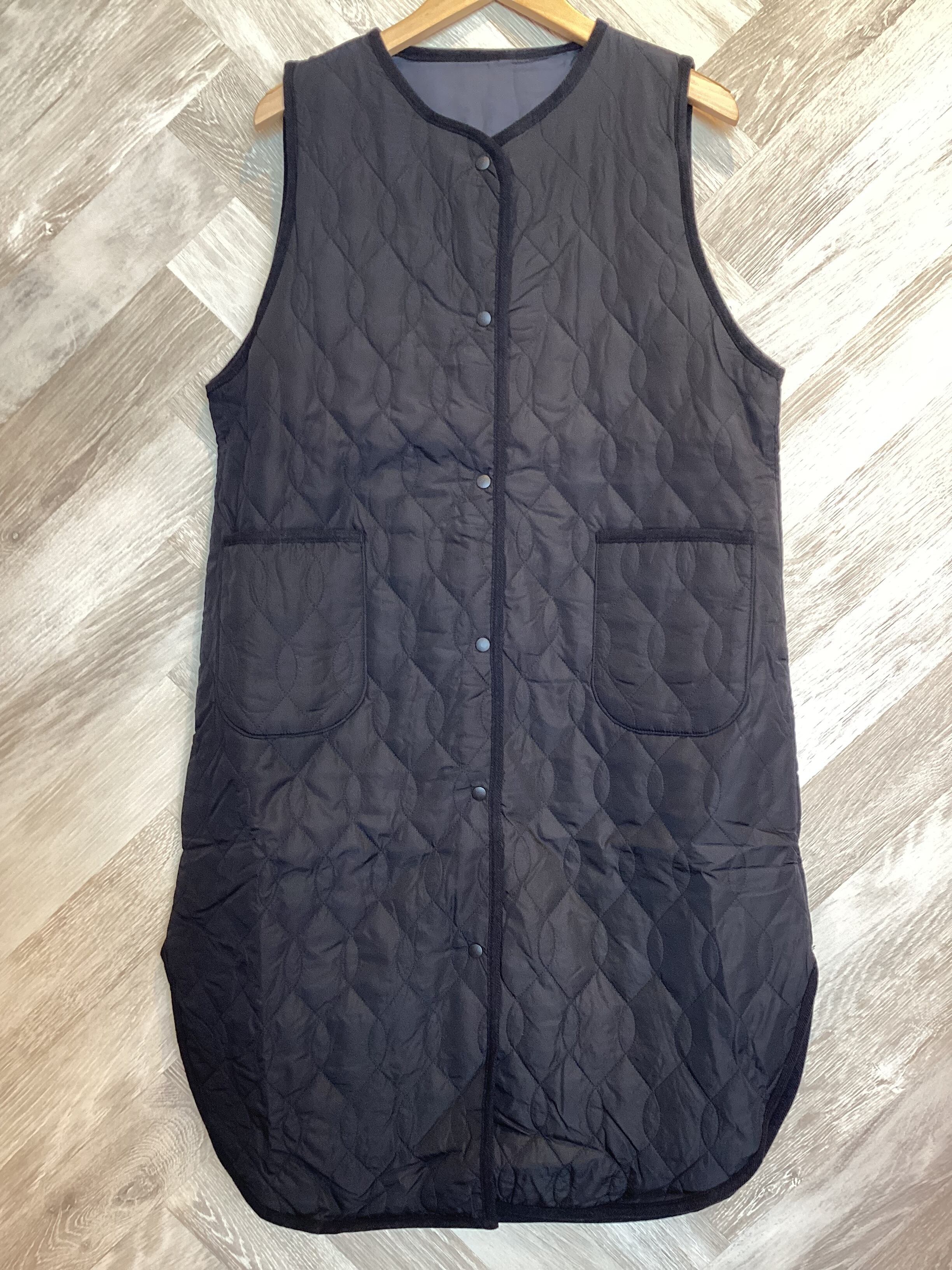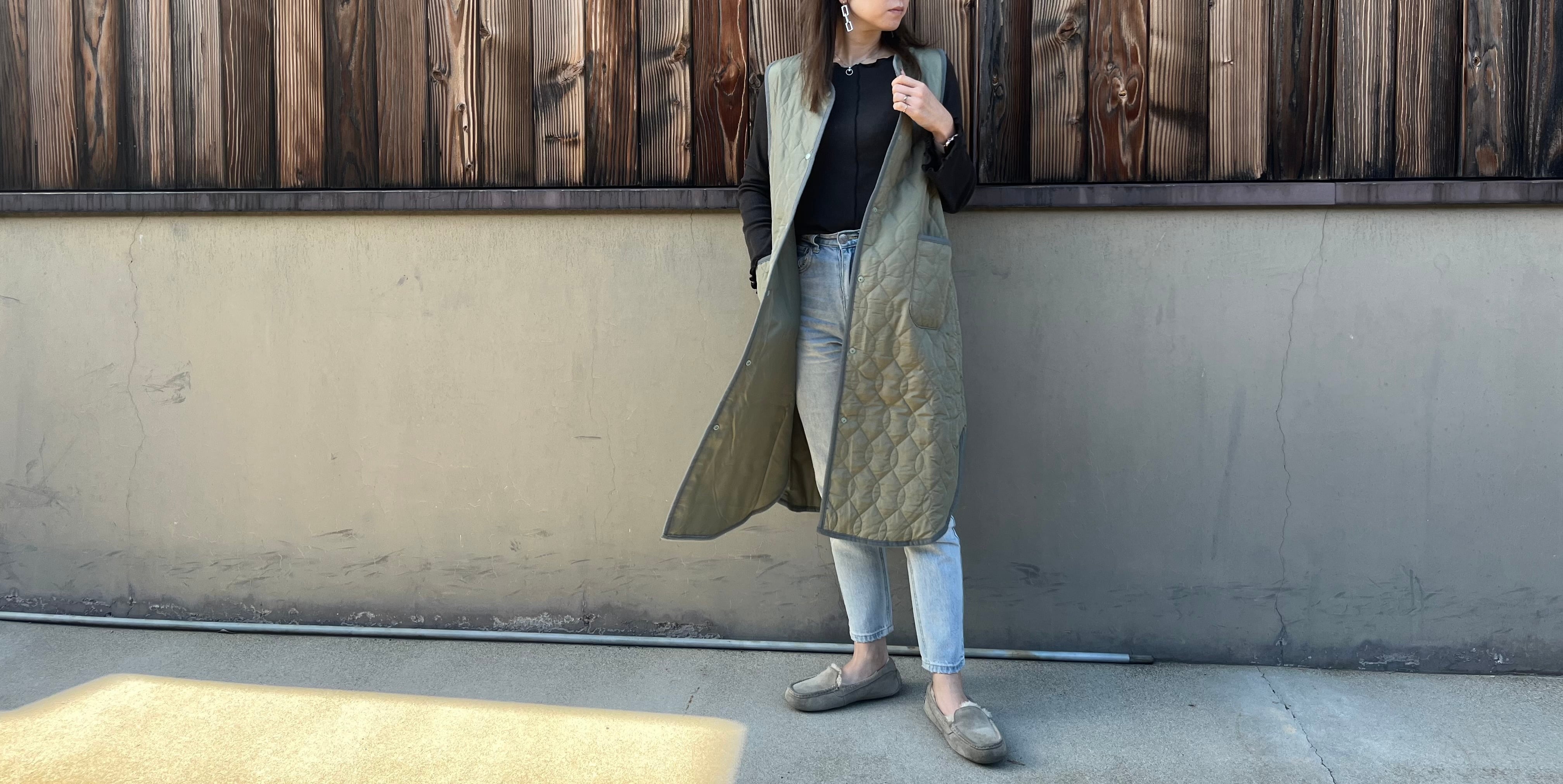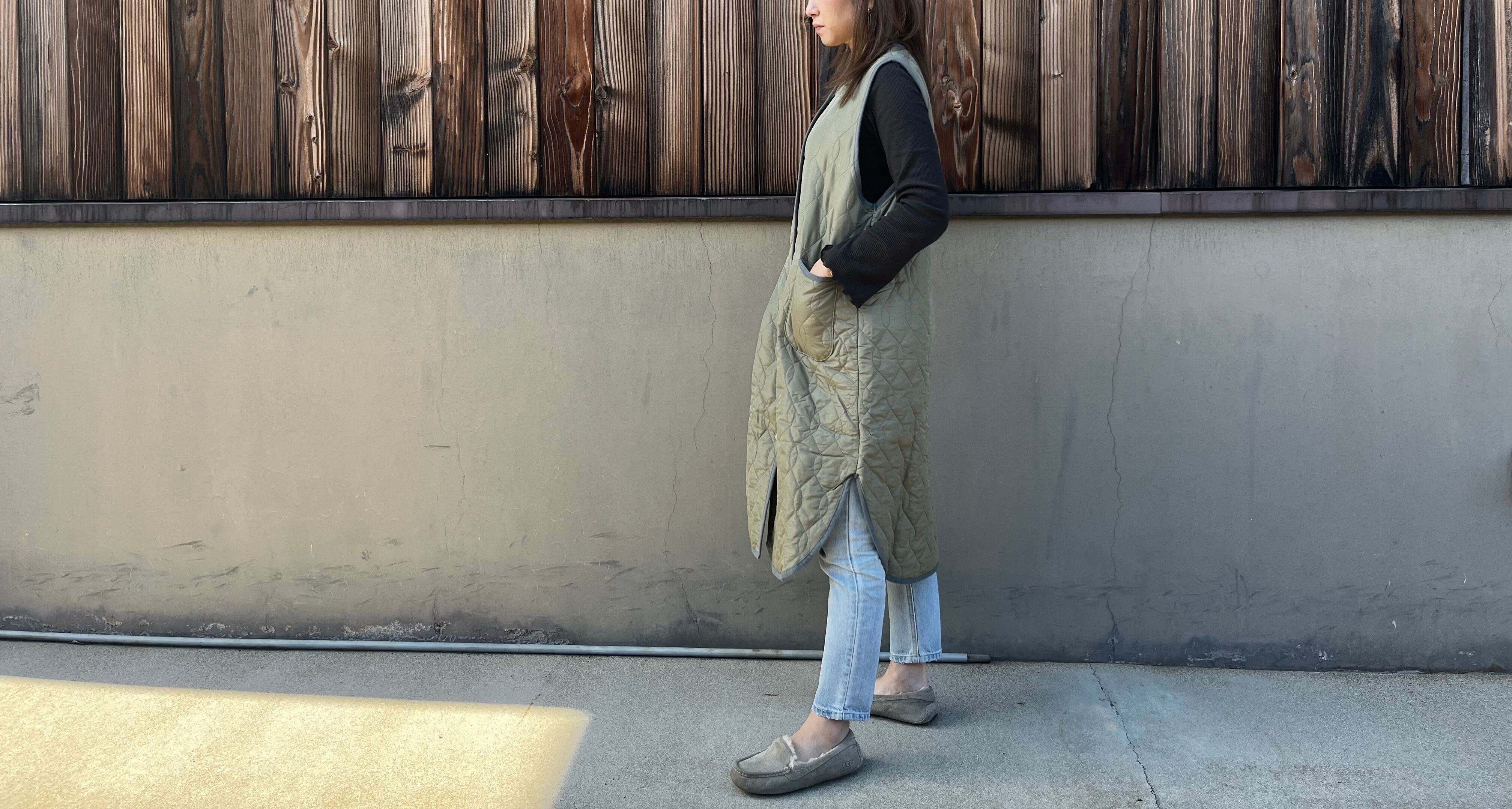 キルティング加工された中綿入りのロングベストです軽くて暖かいのが特徴です