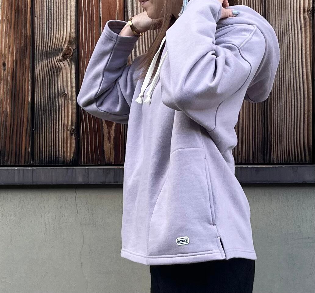 ゆったりとしたサイズ感のプルオーバーのパーカー フードは2枚仕立てにししっかりと立体感のある仕上がりにしました ひ