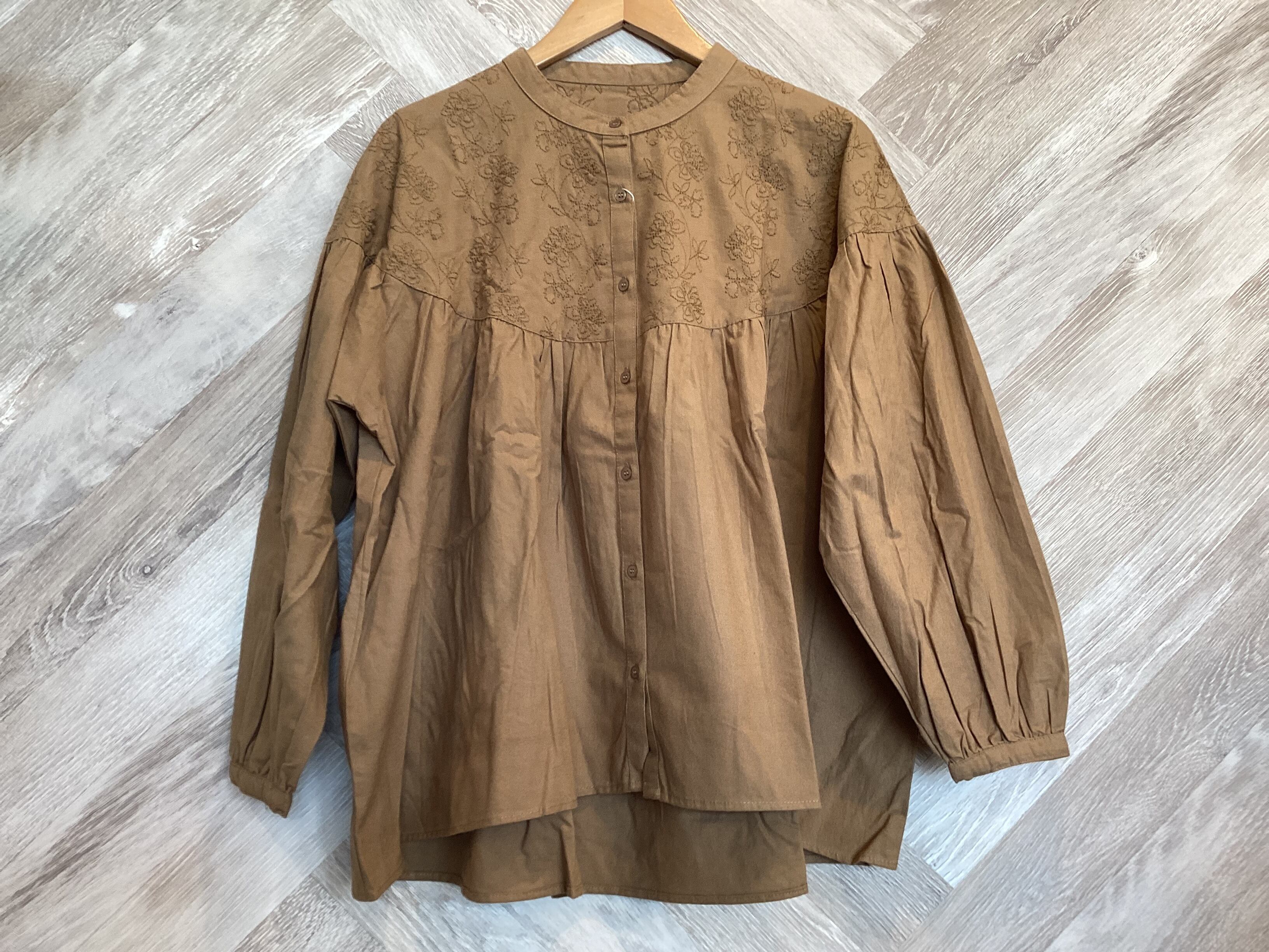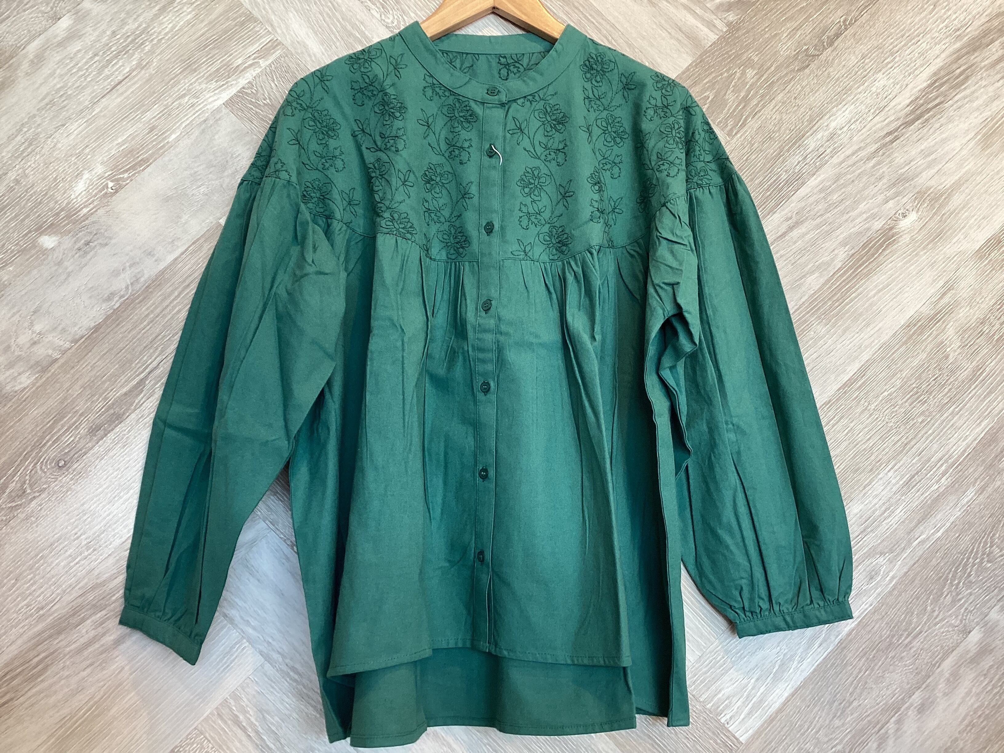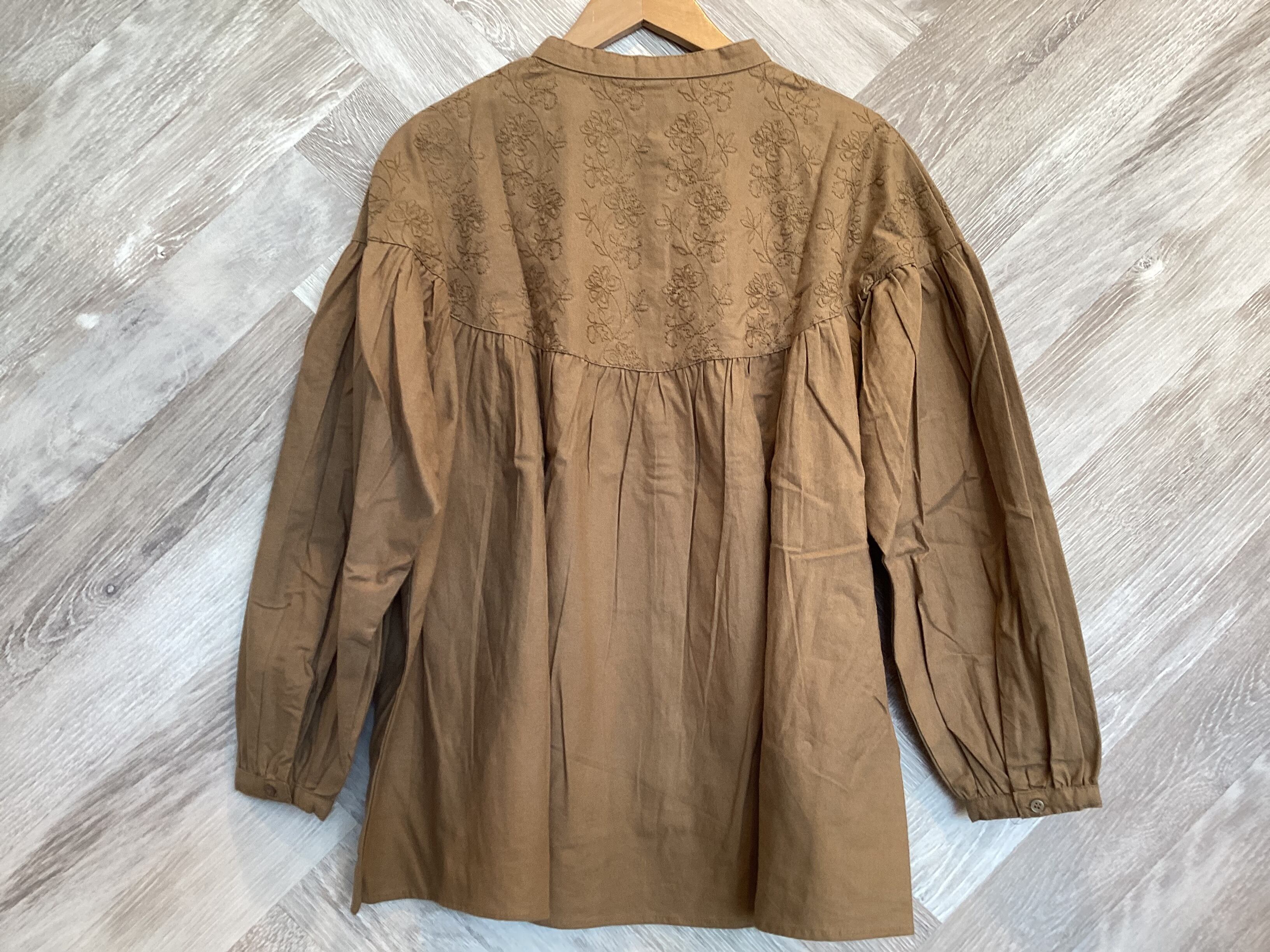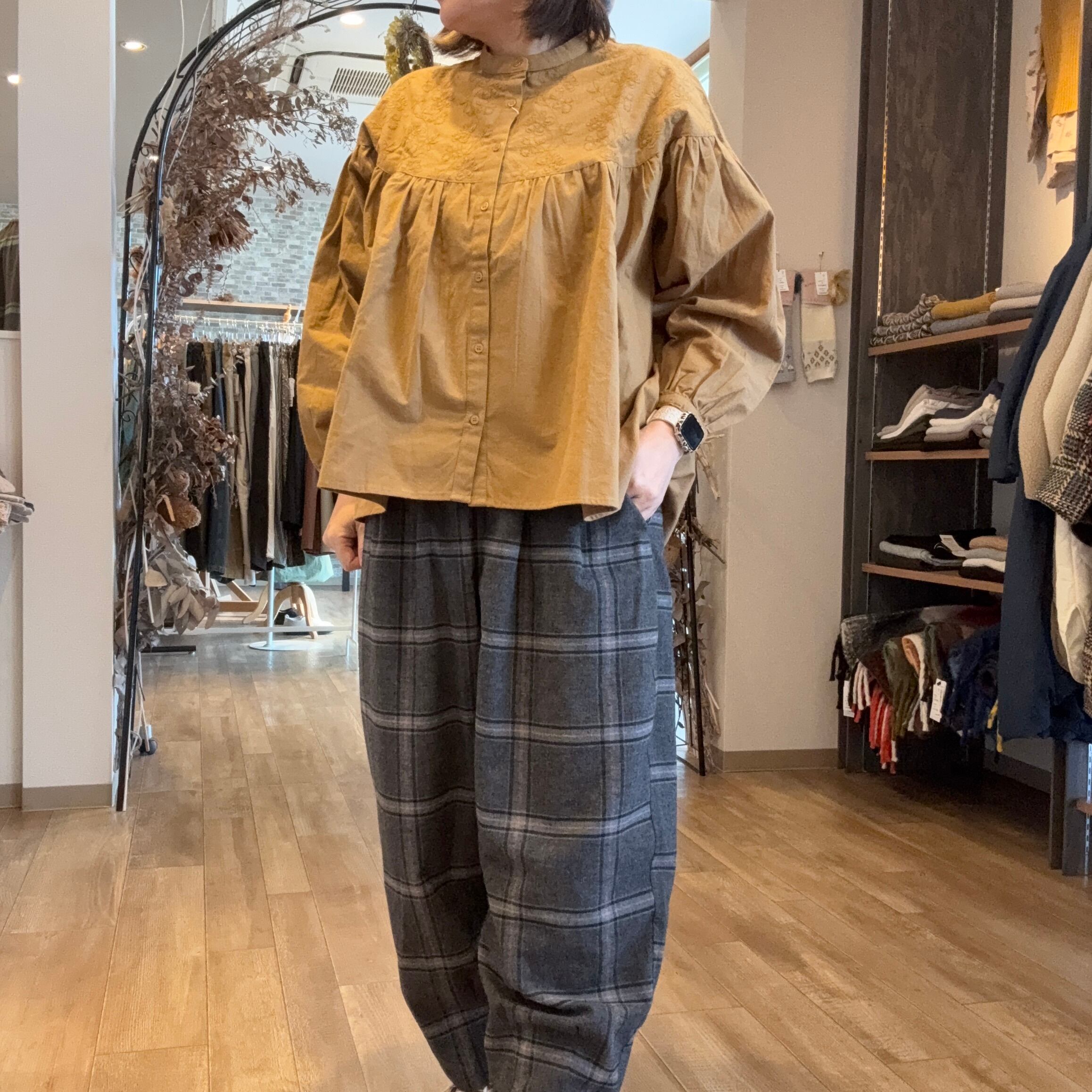 ヨークの刺繍を施し切り替えにはギャザーが入っているのでふわっとしたシルエットのアイテムです