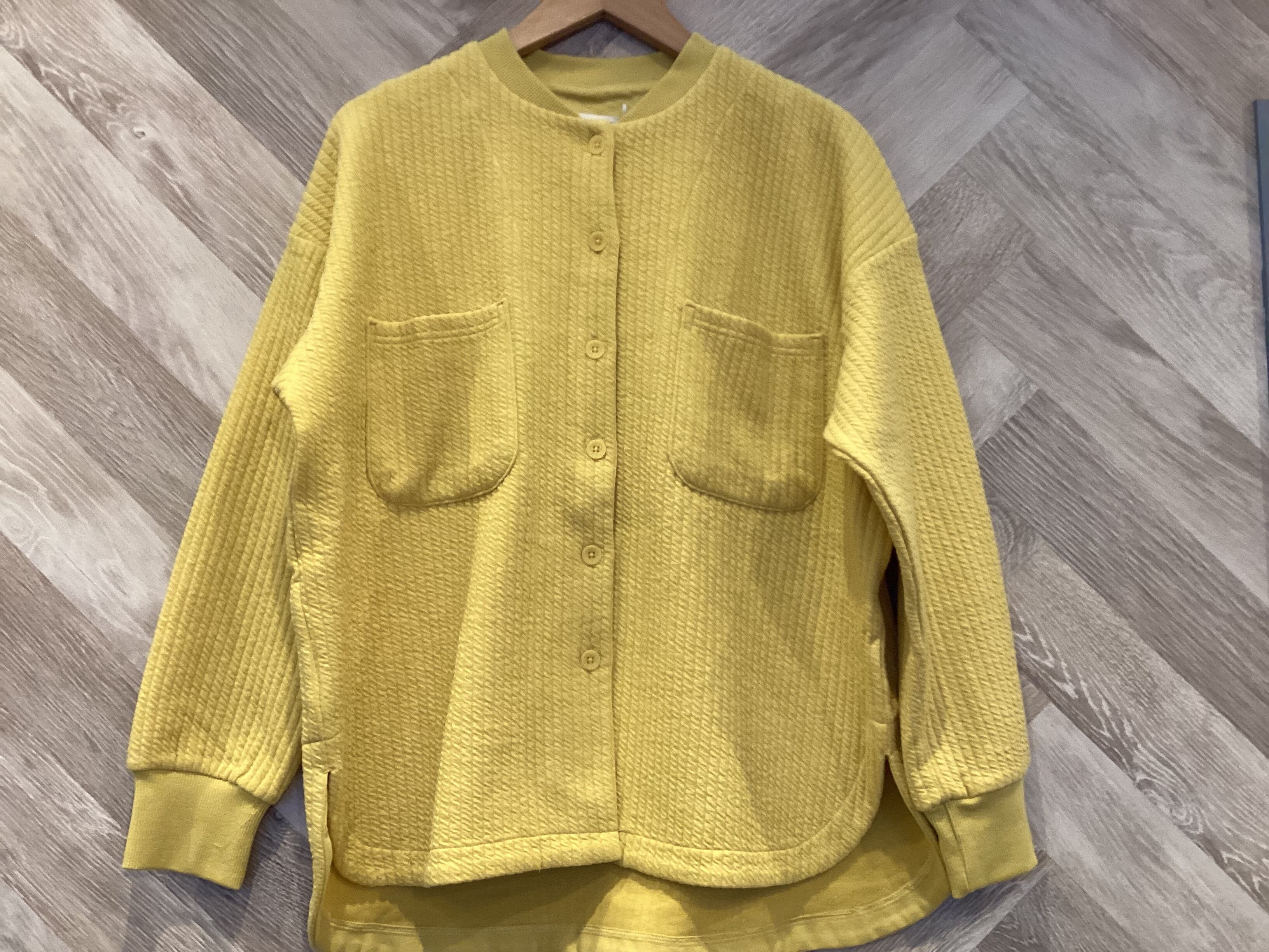 サイドのラウンドしたヘムラインおおきめのパッチポケット付きデイリーに着回せるブラック 明るめボトムスに合わせやすいライトグレーとイエローの3色展開です